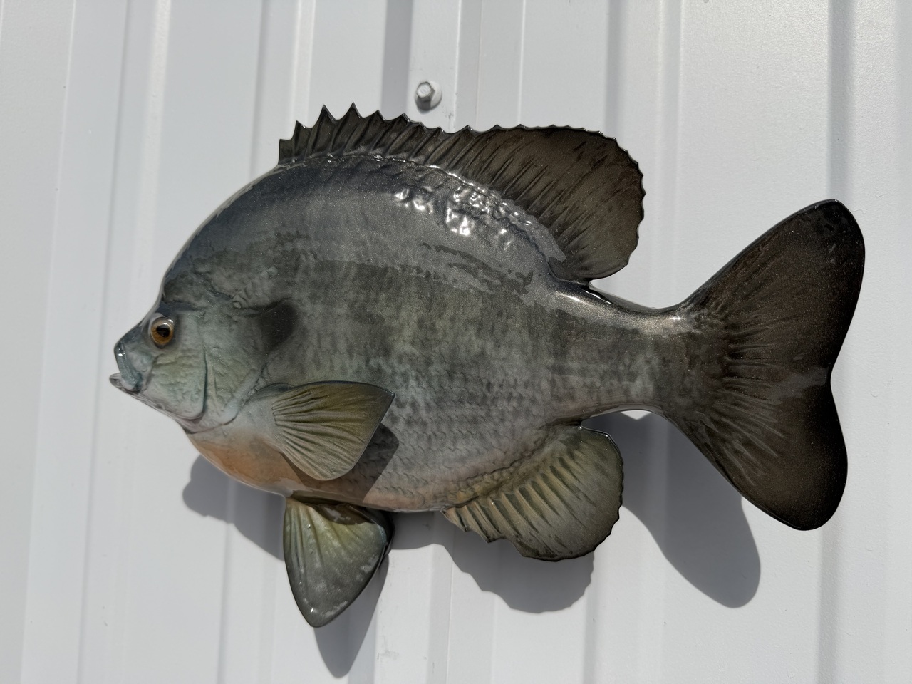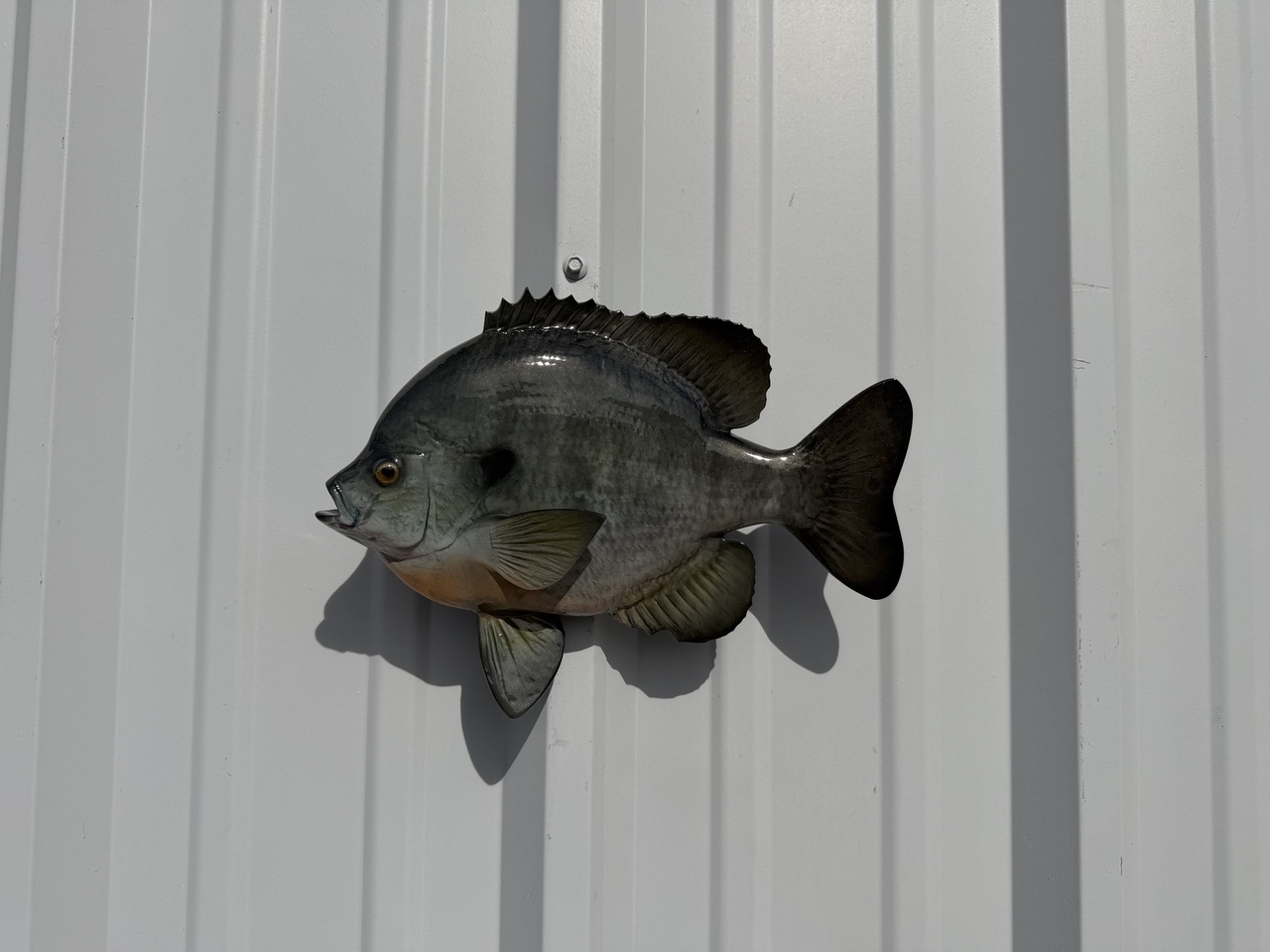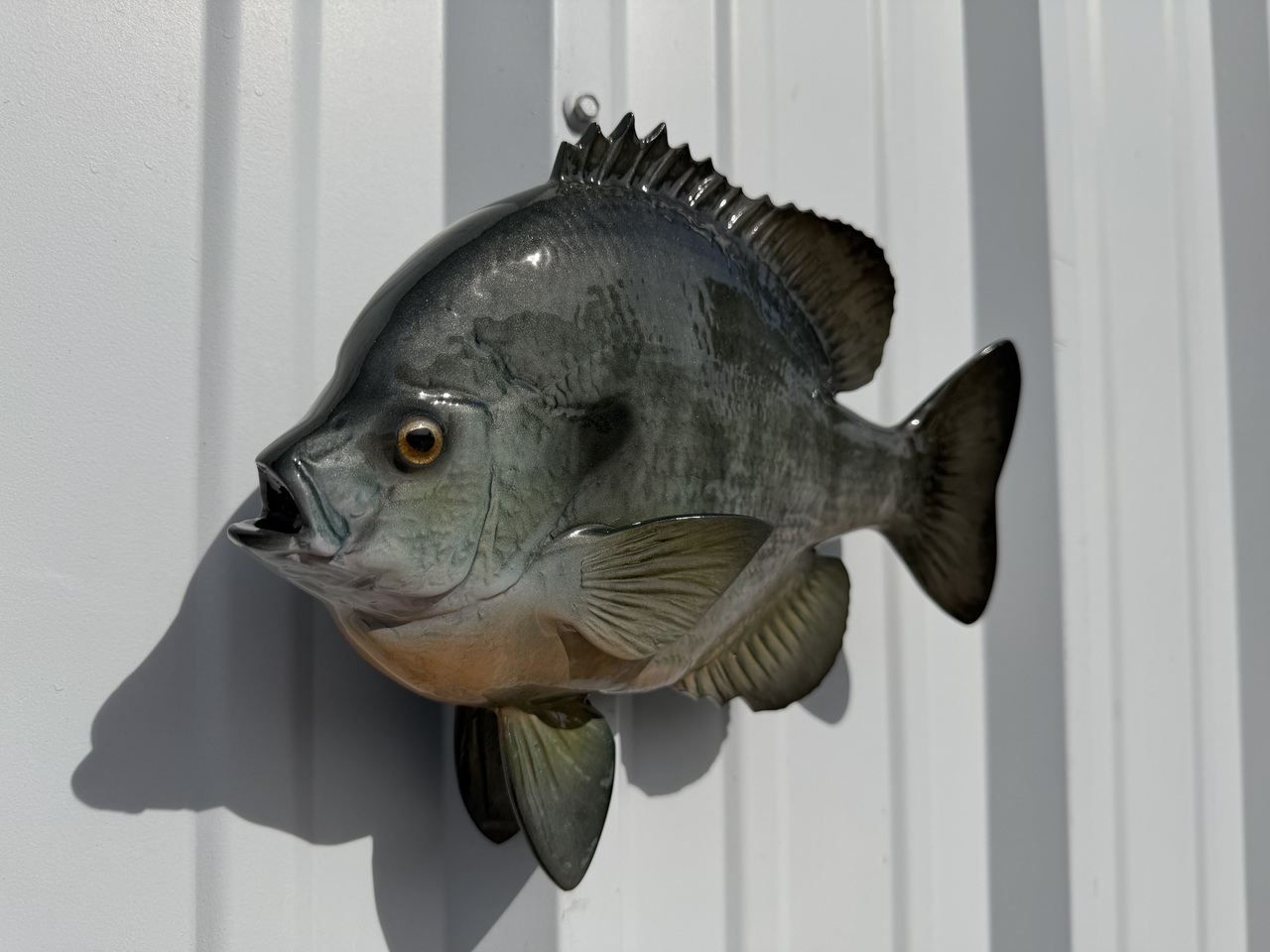 This 12" Bluegill mount is in stock and ready to ship. The images you see within this description and above are pictures of the actual bluegill mount you will receive if you order this item. Bluegills are fresh water fish that are commonly found in North America swimming in lakes, rivers, and ponds. These fish usually don't grow over 12 inches but you could get lucky enough one day and catch that record one over 16 inches. This piece is extremely realistic, including custom painted eyes on both sides of the head, and skin texture that was captured during the molding process. This Bluegill fish mount, like all our fish replicas, has a money back guarantee!