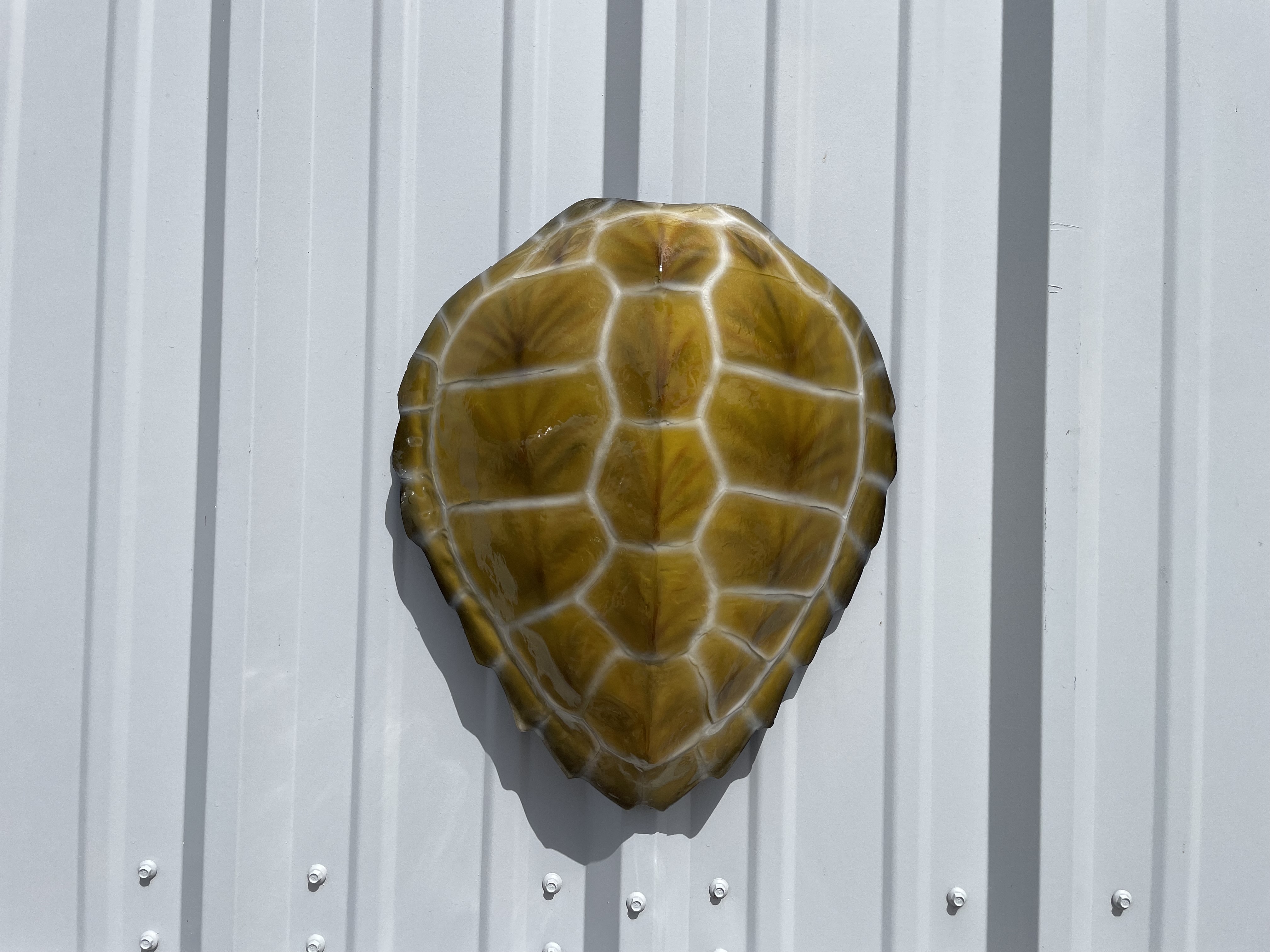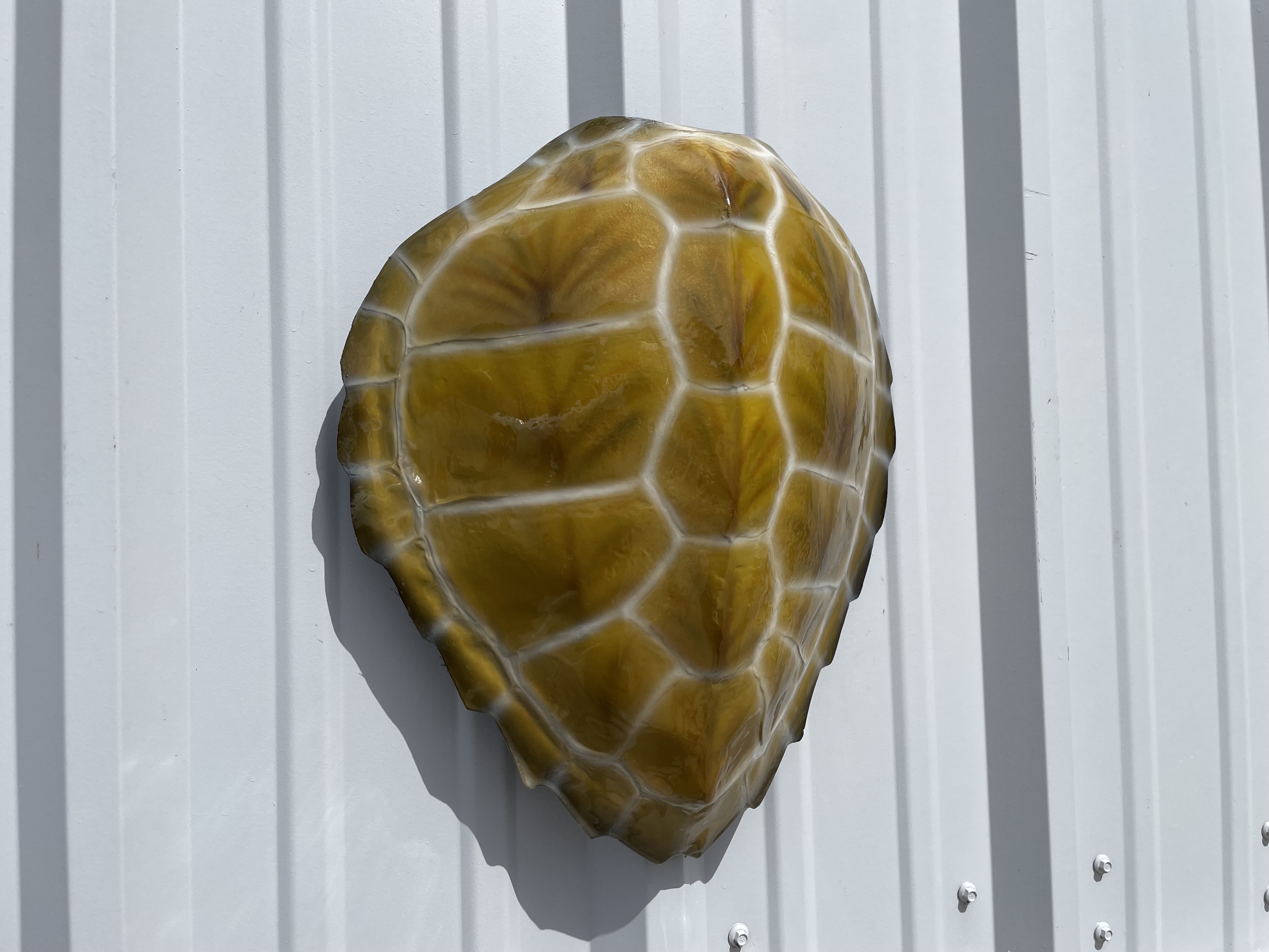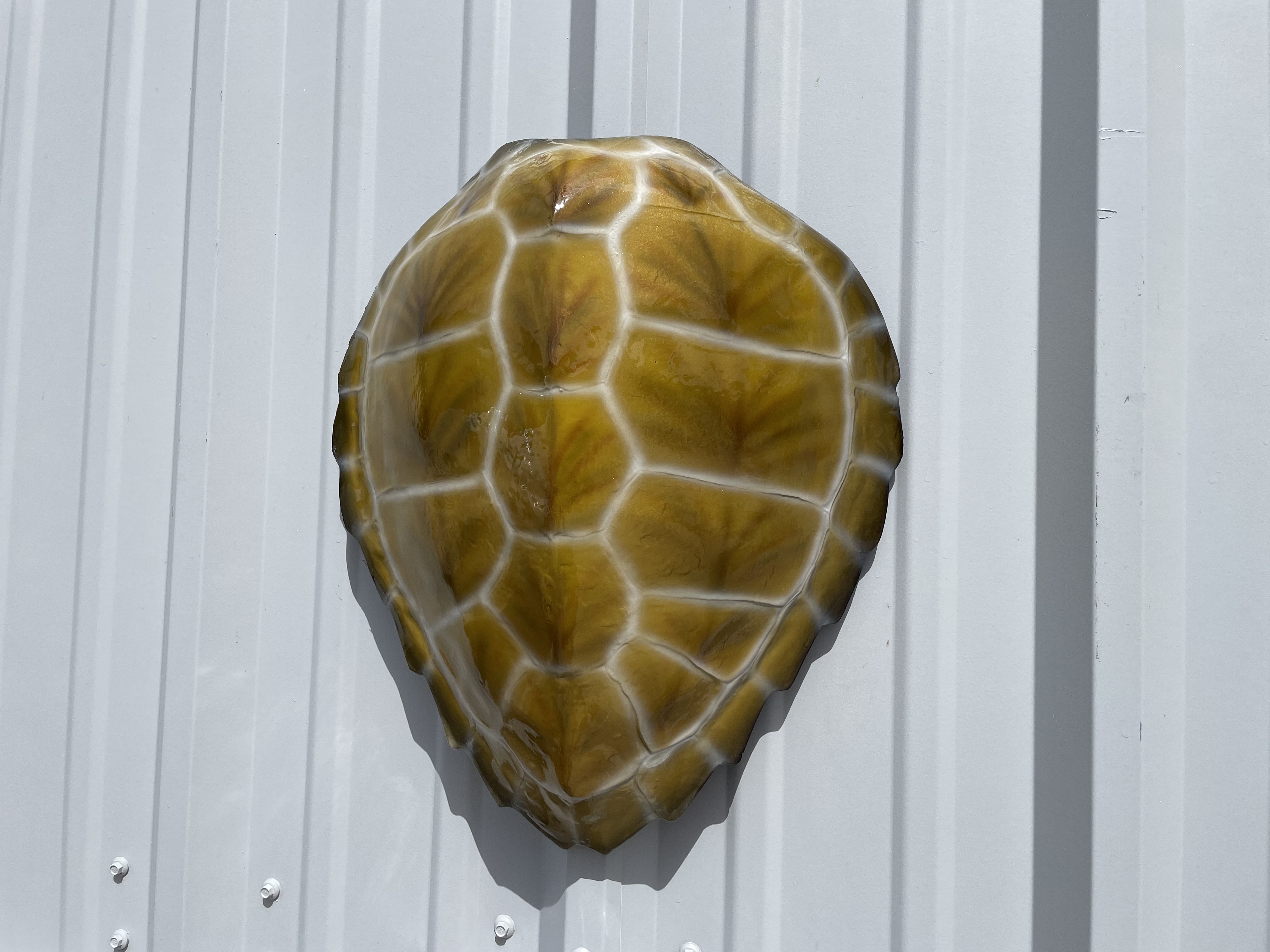 This hawksbill turtle shell mount is part of our half sided series. A half sided mount is produced by casting the front part of our two sided wall mount molds. When displayed the circumference of the half mount is either touching the wall or very close to the wall. This process cuts labor and supplies cost and therefore results in a lower price point however the finishing process is the same as a traditional full mount.