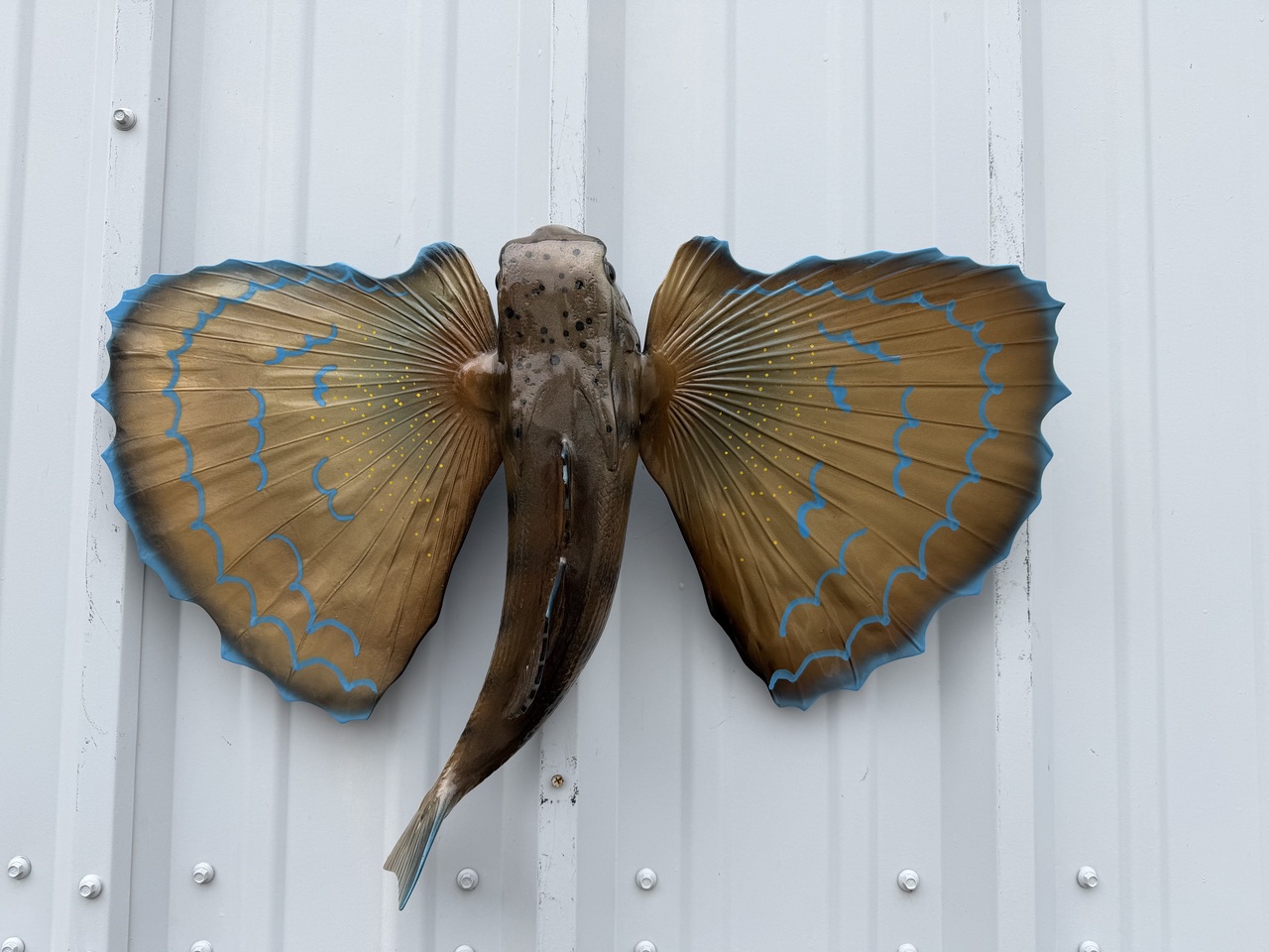 We painted this Flying Gurnard in a lighter color scheme with bright highlights to really give it stunnig, wall appeal. The Flying Gurnard is known for its striking and vibrant coloration. The body itself may display a subdued coloration of grays and browns, which helps to camouflage it against the sandy or muddy sea floors where it dwells. However, it is the large pectoral fins that are truly eye-catching. These wing-like fins can exhibit stunning hues of blue, green, and even hints of red or yellow. The intricate patterns and colors not only serve an aesthetic purpose but also play a role in communication and protection. When the fish is threatened, it will spread its pectoral fins wide, displaying this brilliant coloration. This can startle or confuse predators, giving the Flying Gurnard a chance to escape. In some cases, the coloration might mimic other more venomous organisms, acting as a warning to would-be attackers. The color and pattern of the Flying Gurnard's fins can vary among individuals and even change based on factors like mood, age, and environmental conditions. This complex and dynamic coloration makes the Flying Gurnard a favorite among divers, photographers, and marine enthusiasts.The pictures you see in this listing are the actual pictures of the Flying Gurnard you will receive.