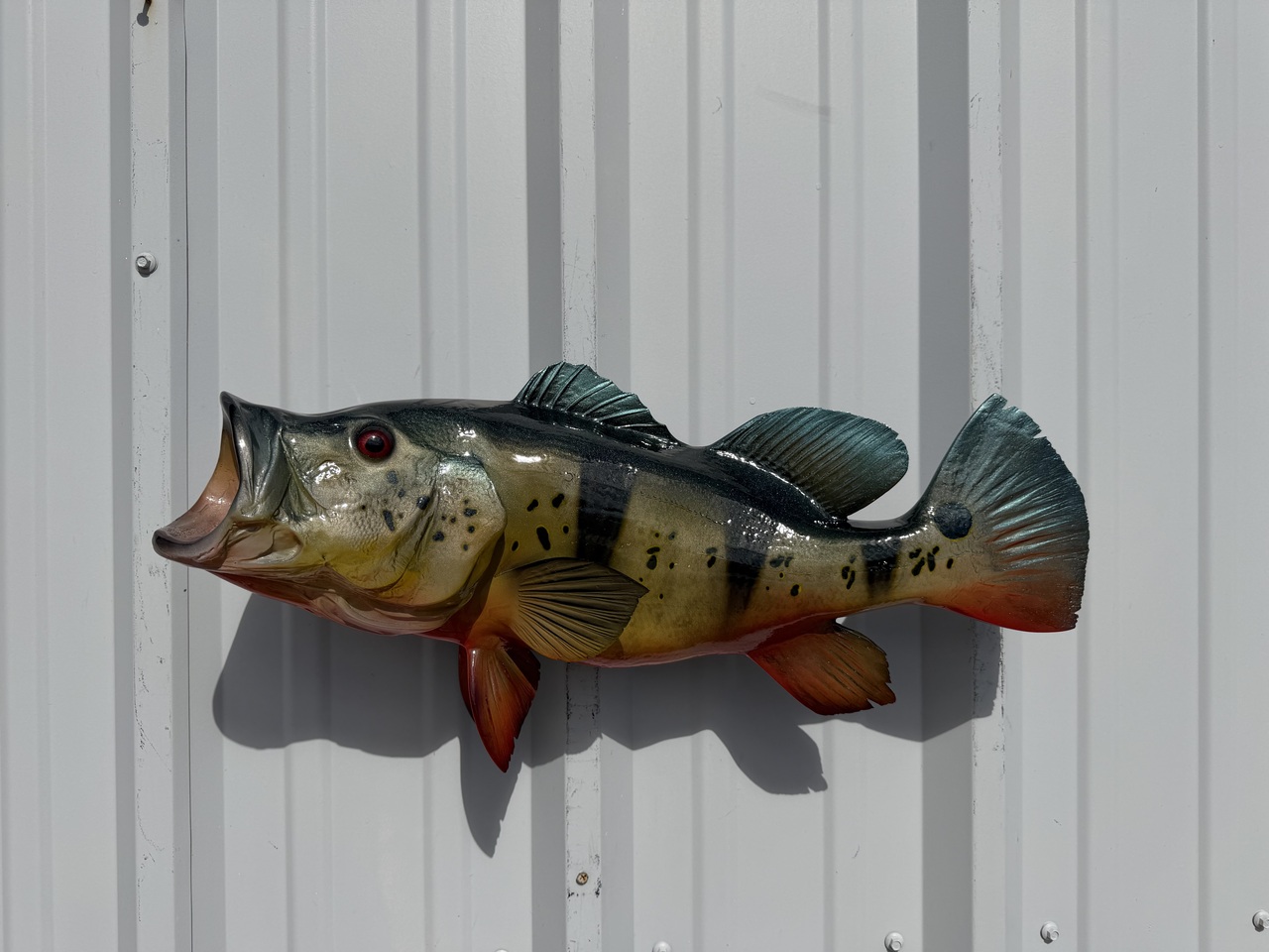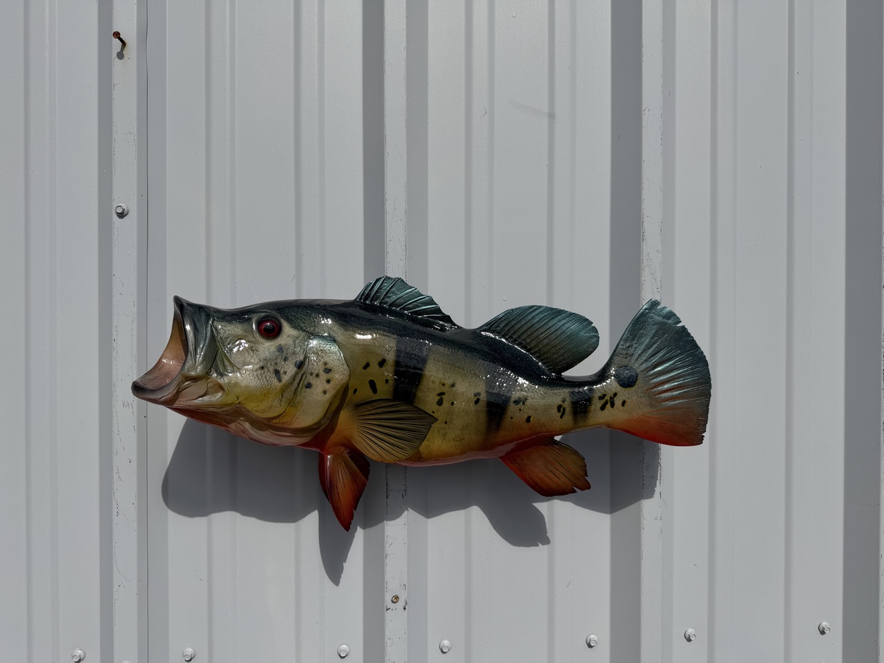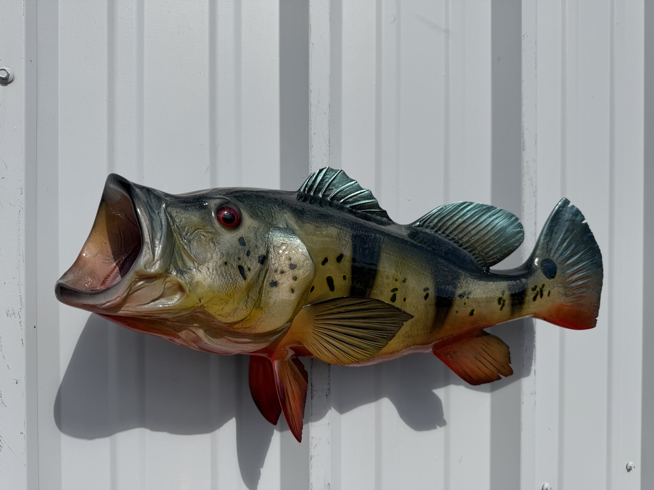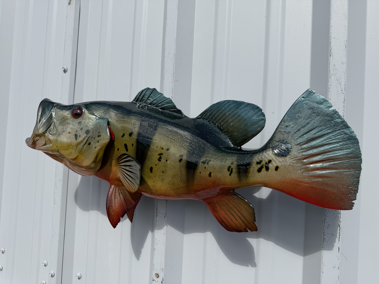 This extremely realistic 23" Peacock Bass Fish Mount is fro sale, in stock and ready to ship. The images you will soon see within this description and above are pictures of the actual peacock bass mount you will receive if you order this item. The blank that is used to produce this replica was cast off an actual 23" Peacock Bass, was posed with an open mouth, and has captured all the beautiful and fine skin detail. Everything that can be seen when up on all the wall is finished. Peacock Bass can be found in warm lakes and ponds ranging from the Amazon Basin to Southern Florida.