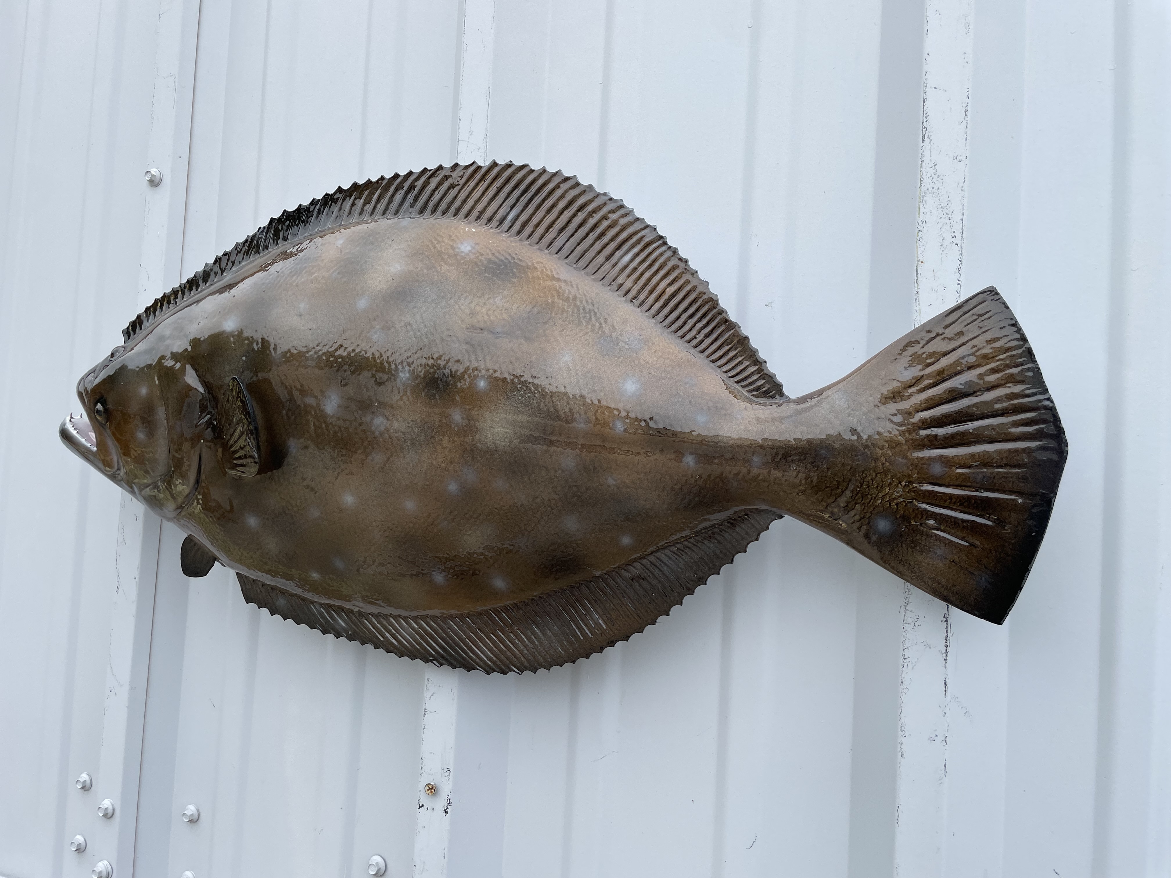 With all our full mounts we encourage our customers to send in a picture of their catch so we can paint and replicate to match that fish. If you don't have a picture of your catch our normal process is to paint a standard gold, brown and black base tone coloring with white spots and speckles mixed throughout. The final step is to clear coat the Flounder replica with a UV Protectant Urethane clear coat.