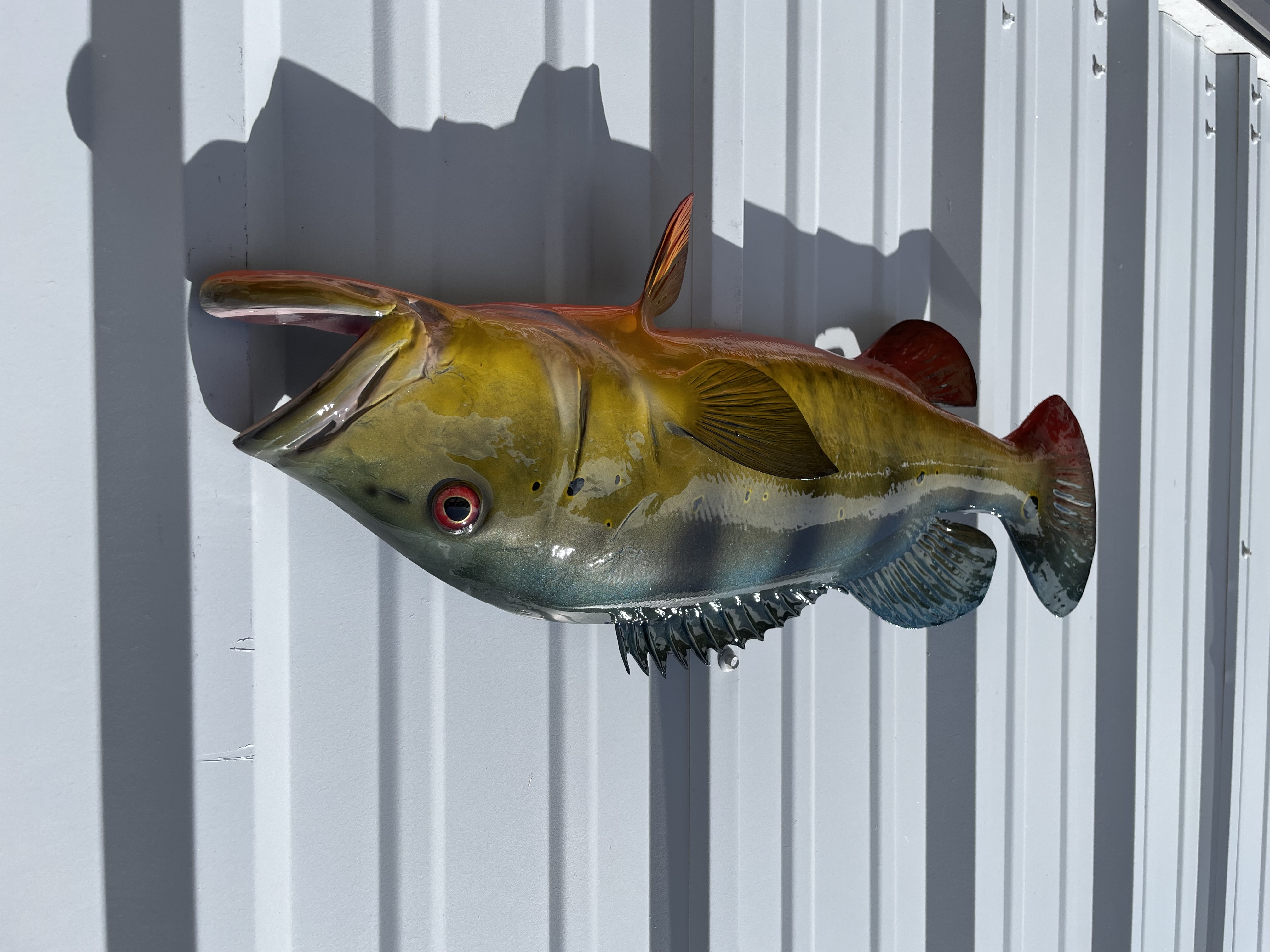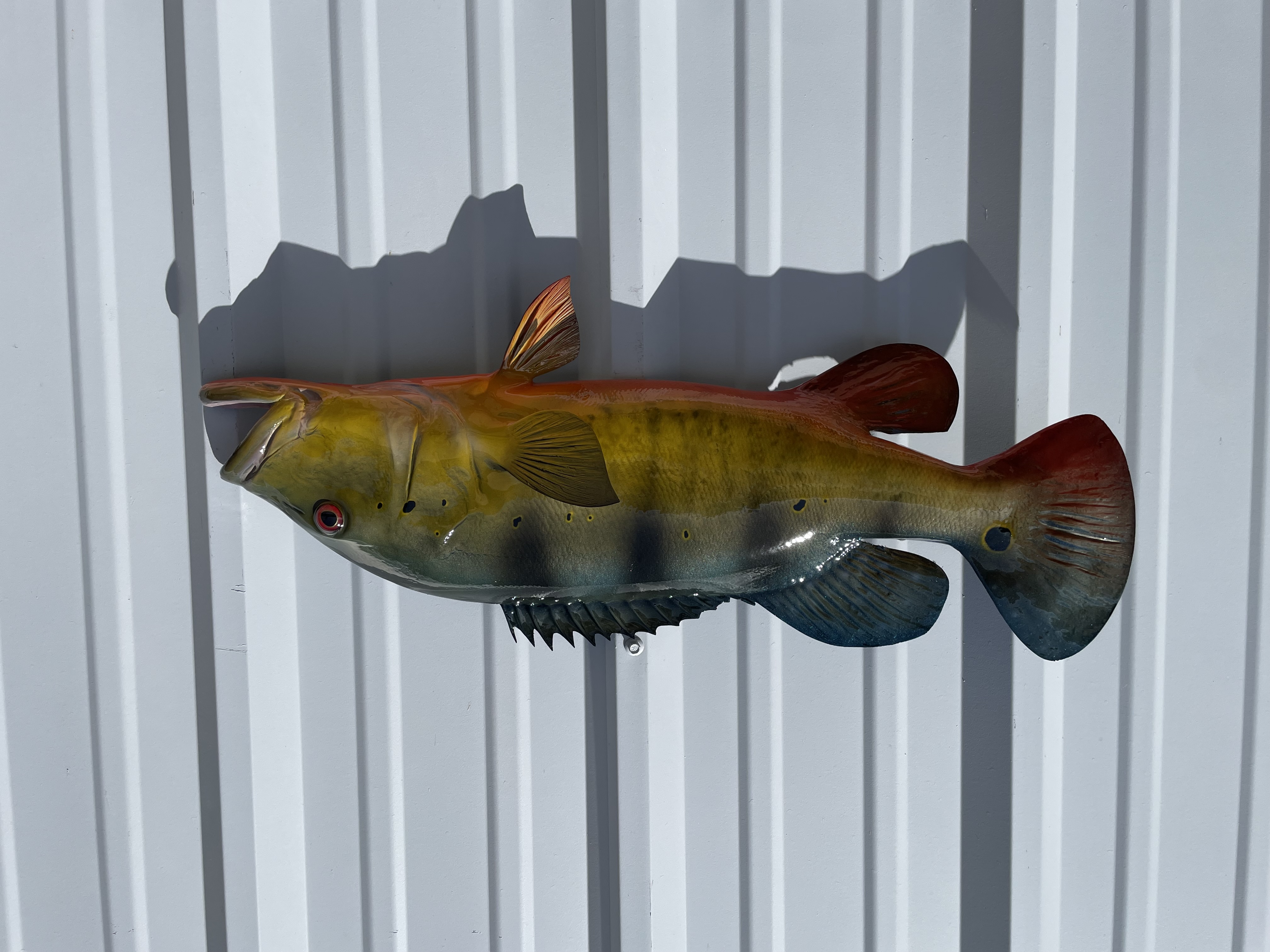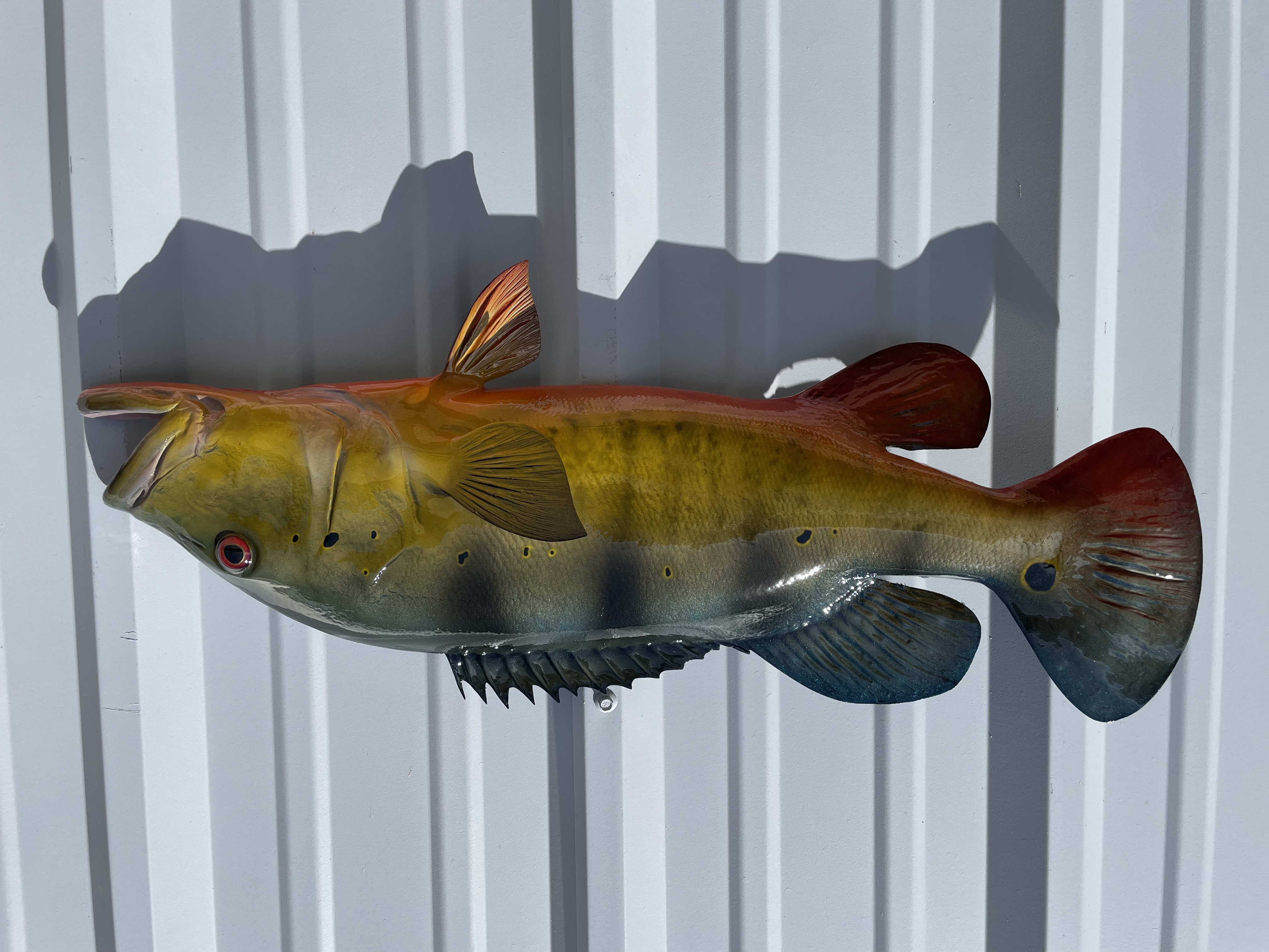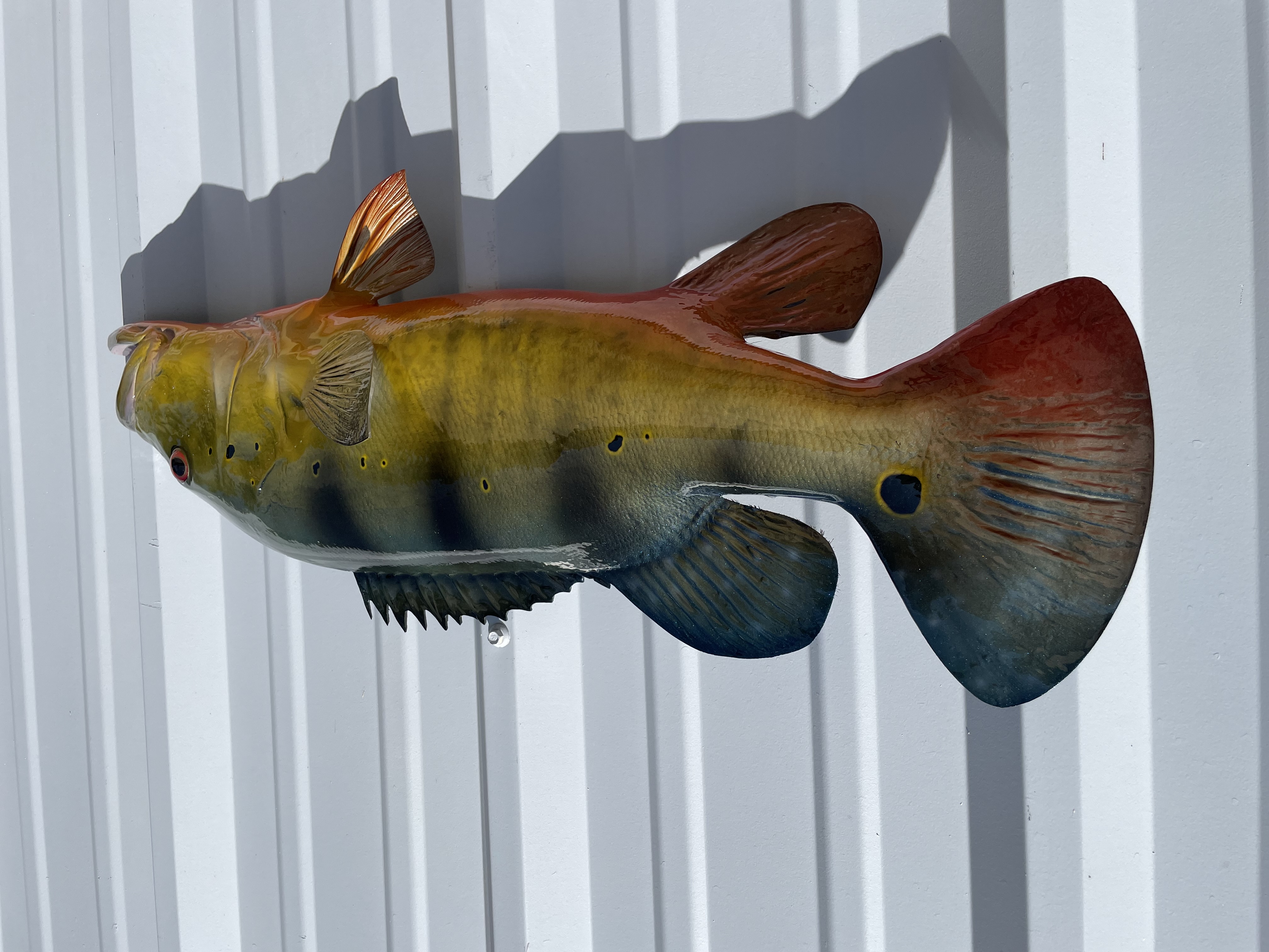 Peacock Bass normally have dark green backs with a tint of blue, 3-4 black vertical bars, yellow sides that blend down to a bright red-orange belly. Like other fish, peacock bass can have many different variations of coloring however our standard paint job includes the above mentioned features. The final step of the finishing process is to spray a UV protecting clear coat to give it superior protection indoors or outside. We do not custom paint our half sided series replicas.