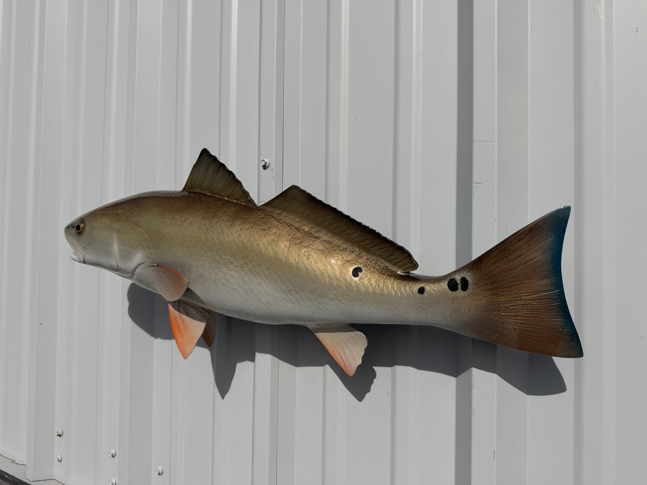 This beautiful 27" left facing redfish full mount, which we call a two sided wall mount, has incredible relief on this scales and was molded off a Florida beach caught red drum. This fish mount is extremely realistic, including custom painted eyes on both sides of the head and great skin texture that was captured during the molding process.