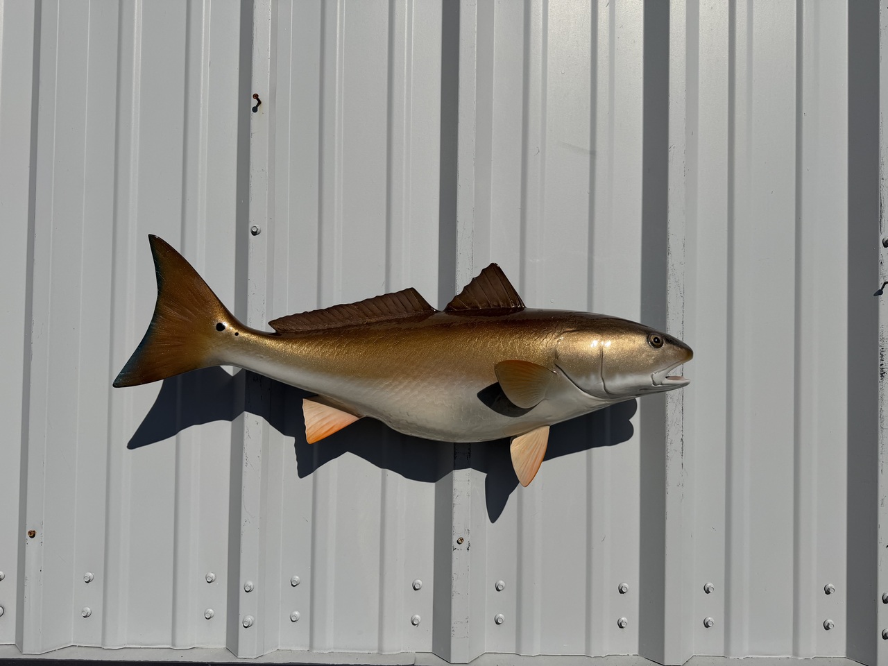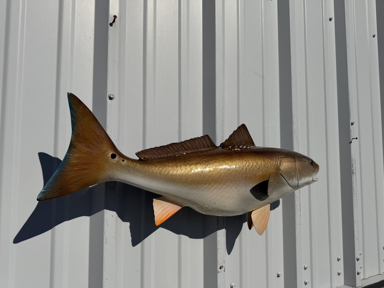 We painted this redfish to have the same deep, rich copper coloring as if it was cruising through the backwaters or Louisiana or the shallow flats of the Mosquito Lagoon. We airbrushed a very typical single spot on the upper portion of the tail and highlighted the edge of the tail with the iridescent blue that many redfish will have when tailing through the flats, eating crabs and shrimp. We incorporated the slight edge that runs from his nose to the top of his gill plates and finished the painting process with an iridescent candy pearl paint to give this beautiful fish mount that extra special touch. The pictures you see in this listing are the actual pictures of the fish replica you will receive.