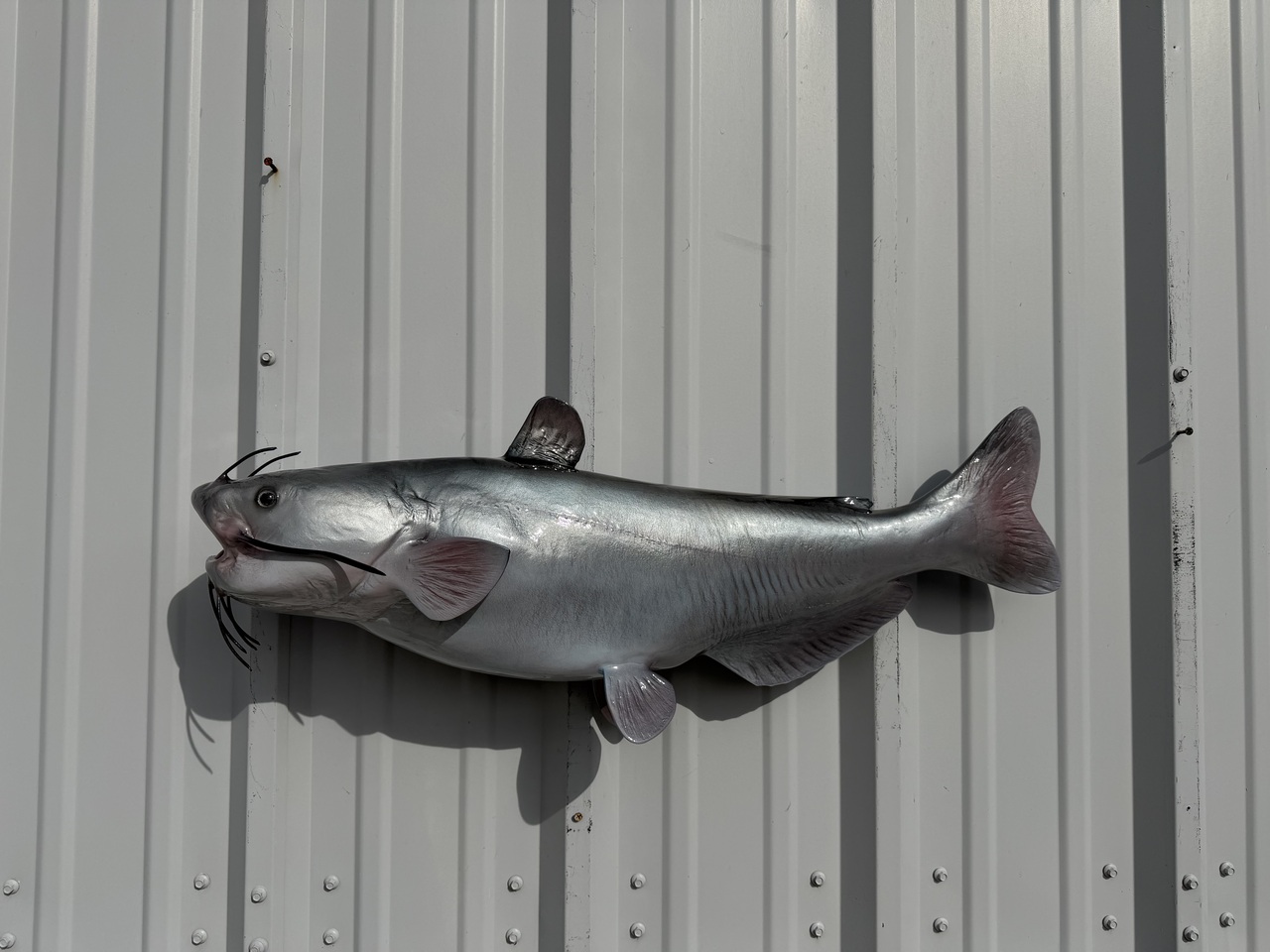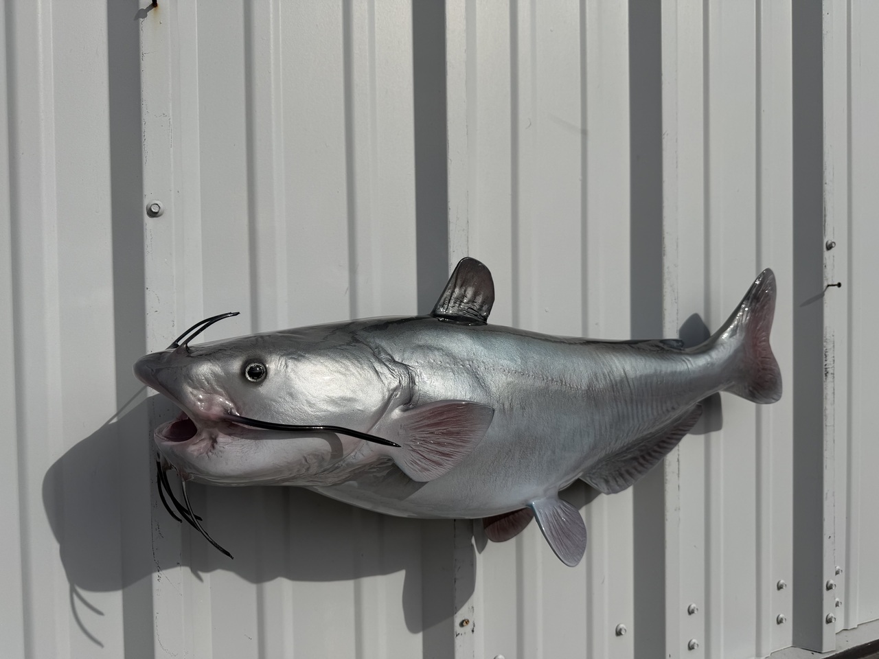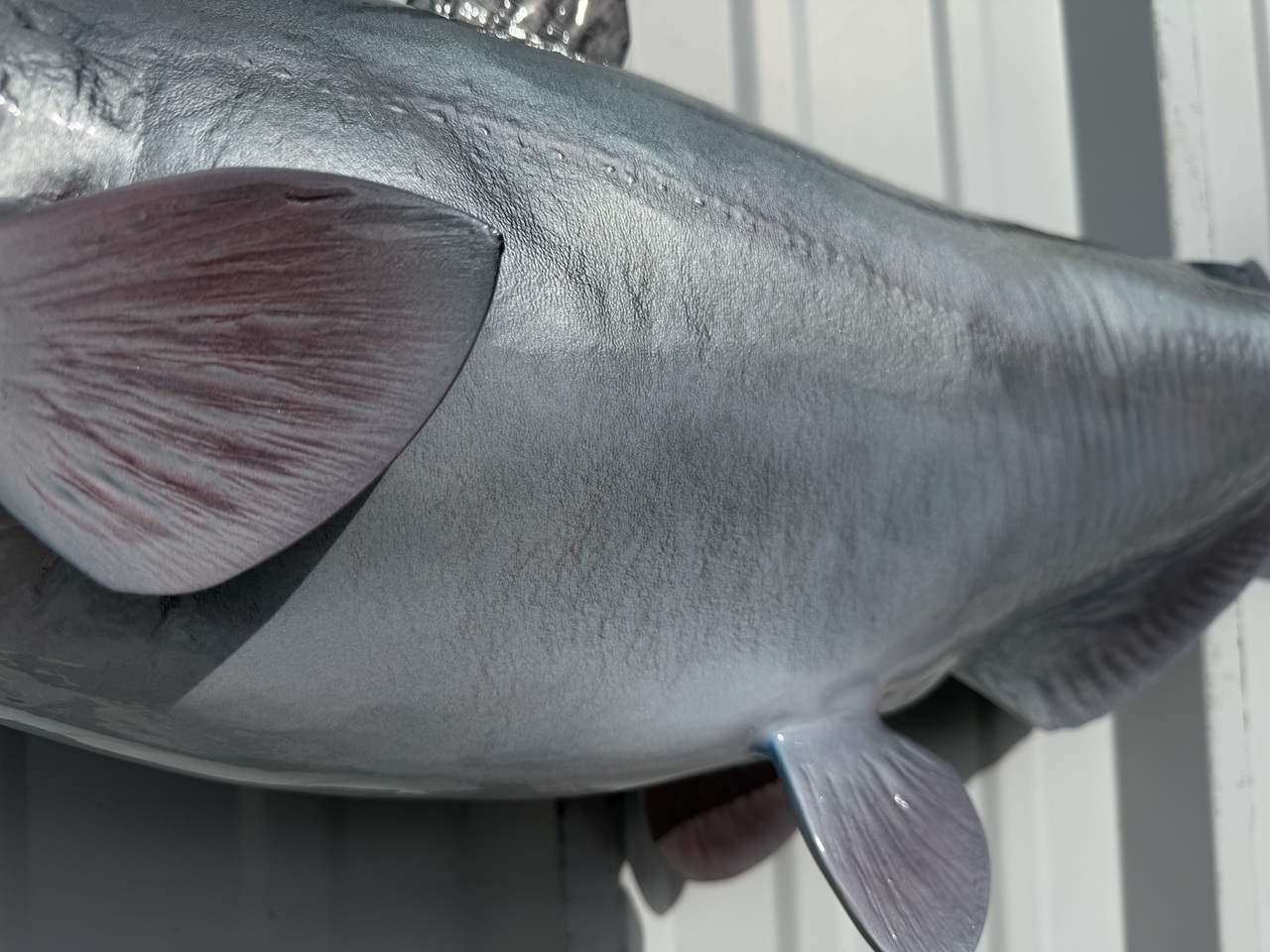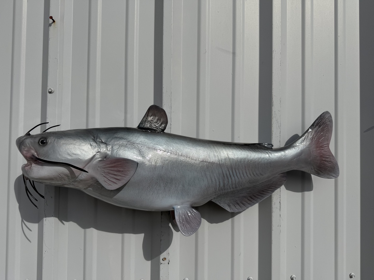 This 31" Blue Catfish mount is in stock and ready to ship. The images you see within this description and above are pictures of the actual catfish mount you will receive if you order this item. Blue catfish grow large with a very big girth making this catfish species the largest. They are found in North America, mainly the Mississippi River and connecting rivers, and also have been introduced into reservoirs across the states and even down into a few Florida lakes.This blue catfish fish mount, like all our fish replicas, has a money back guarantee!