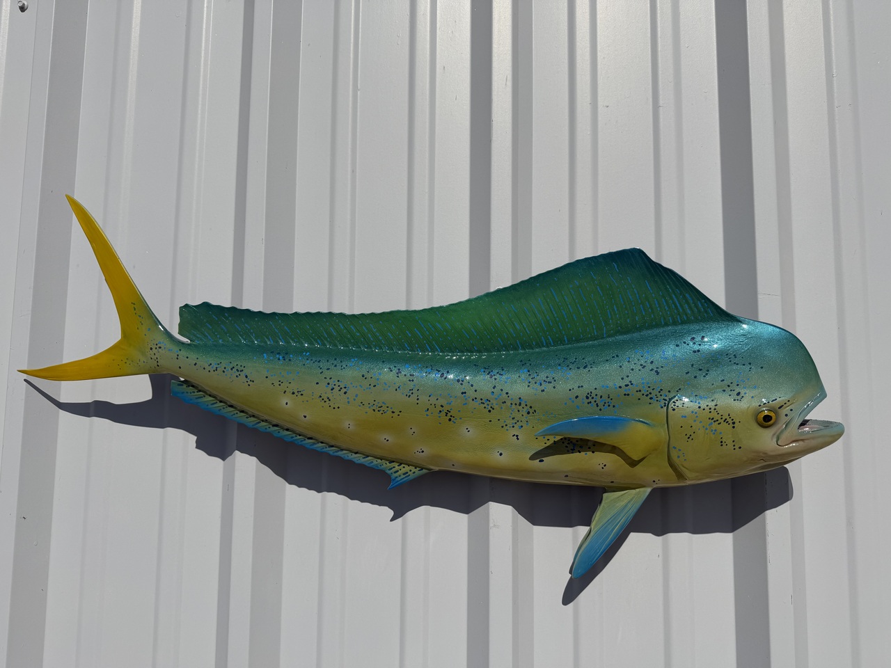 This 36" Bull Dolphin Fish Mount is in stock and ready to ship. The images you see within this description and above are pictures of the actual dolphin you will receive if you order this item. Bull Dolphin are a sought after gamefish around the world with many different names. In Hawaii they call them Mahi Mahi and over in California and Mexico they are called Dorado.