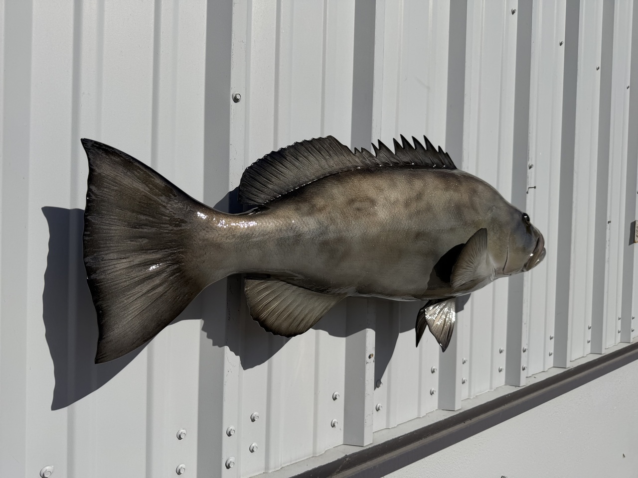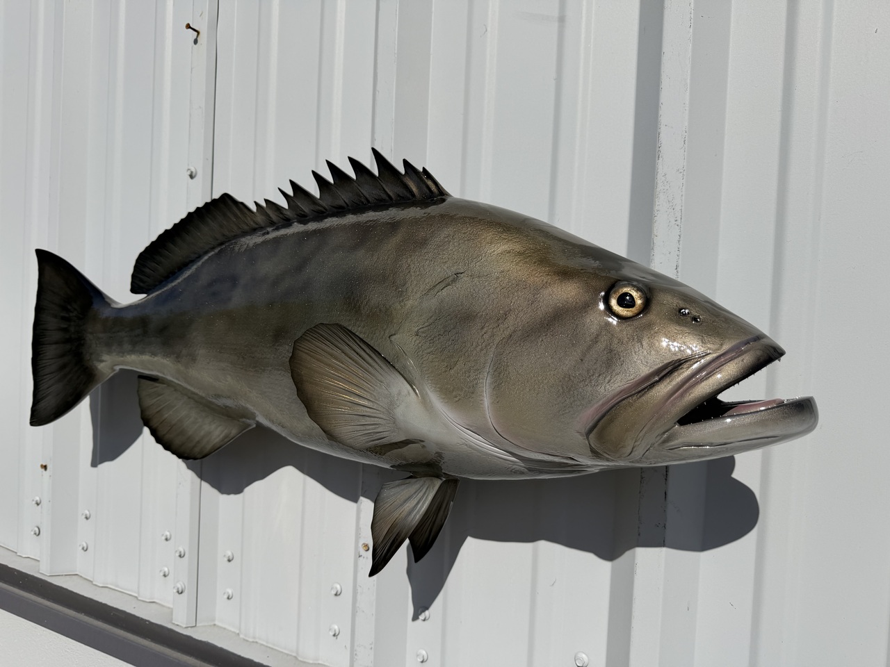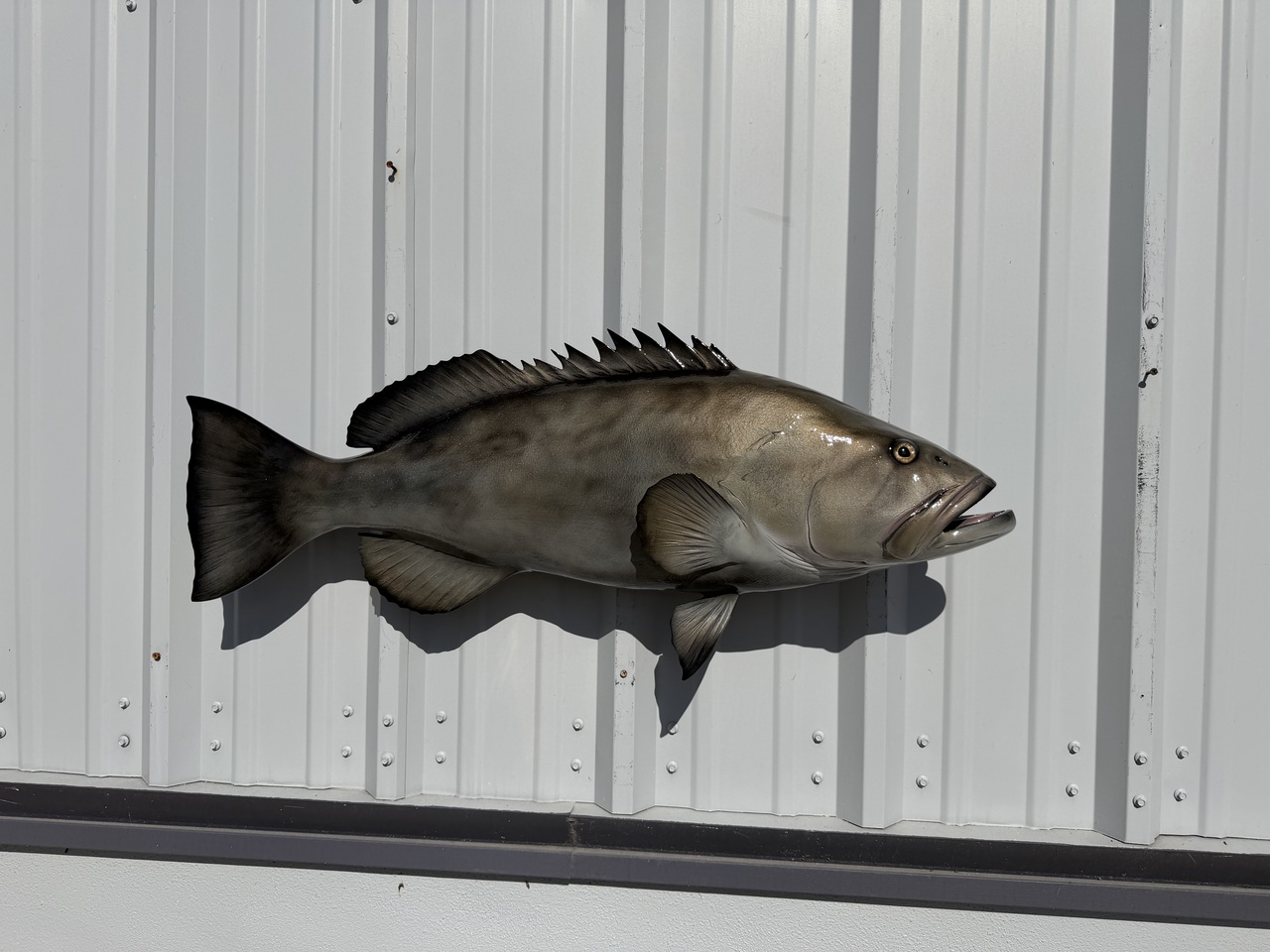 This unique 38" Gag Grouper full mount is in stock and ready to ship. Groupers make their homes in holes, ledges, wrecks and other structured habitat providing themselves with protection and lookout areas to sabotage their next un-expecting prey. This piece is extremely realistic, including custom painted eyes on both sides of the head, artificial mouth gum line texture and skin texture that was captured during the molding process. Everything that is viewable when up on all the wall is finished.