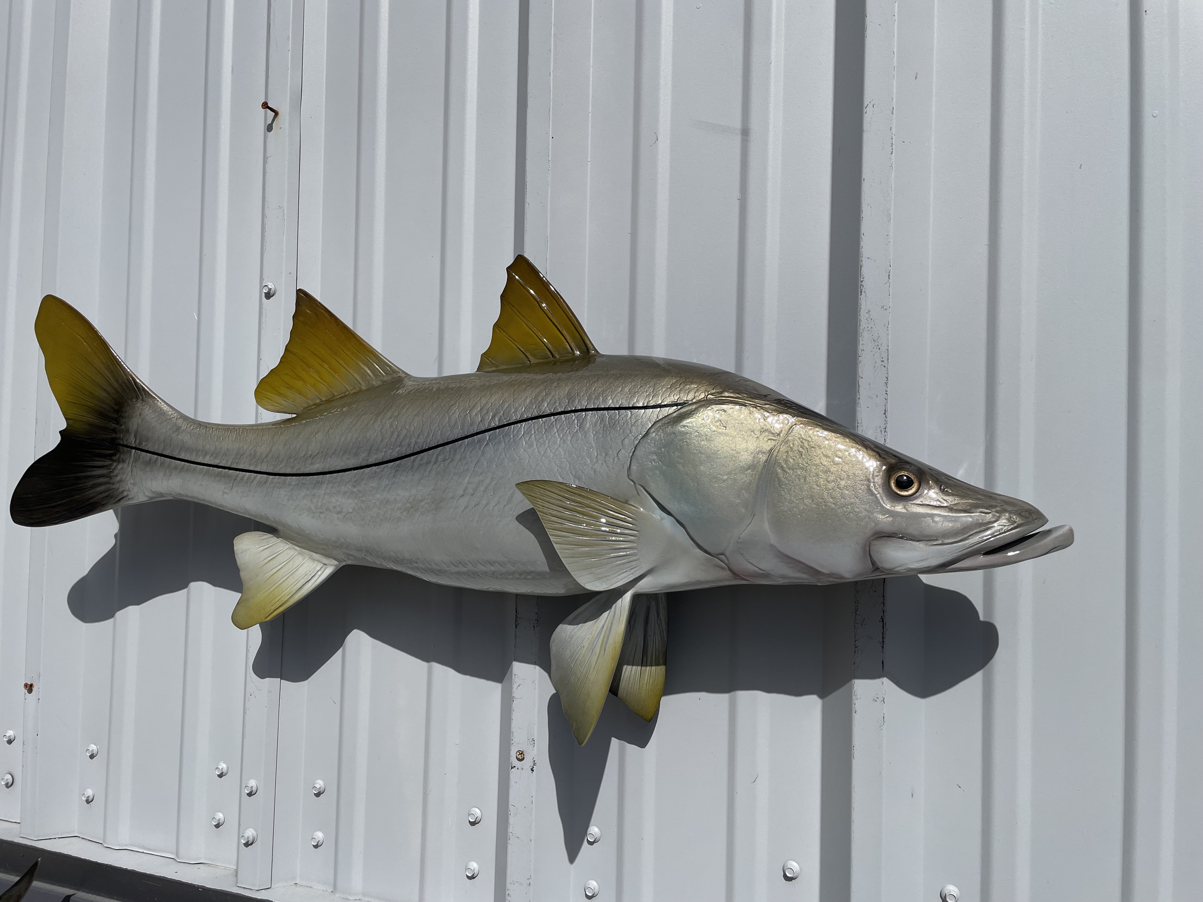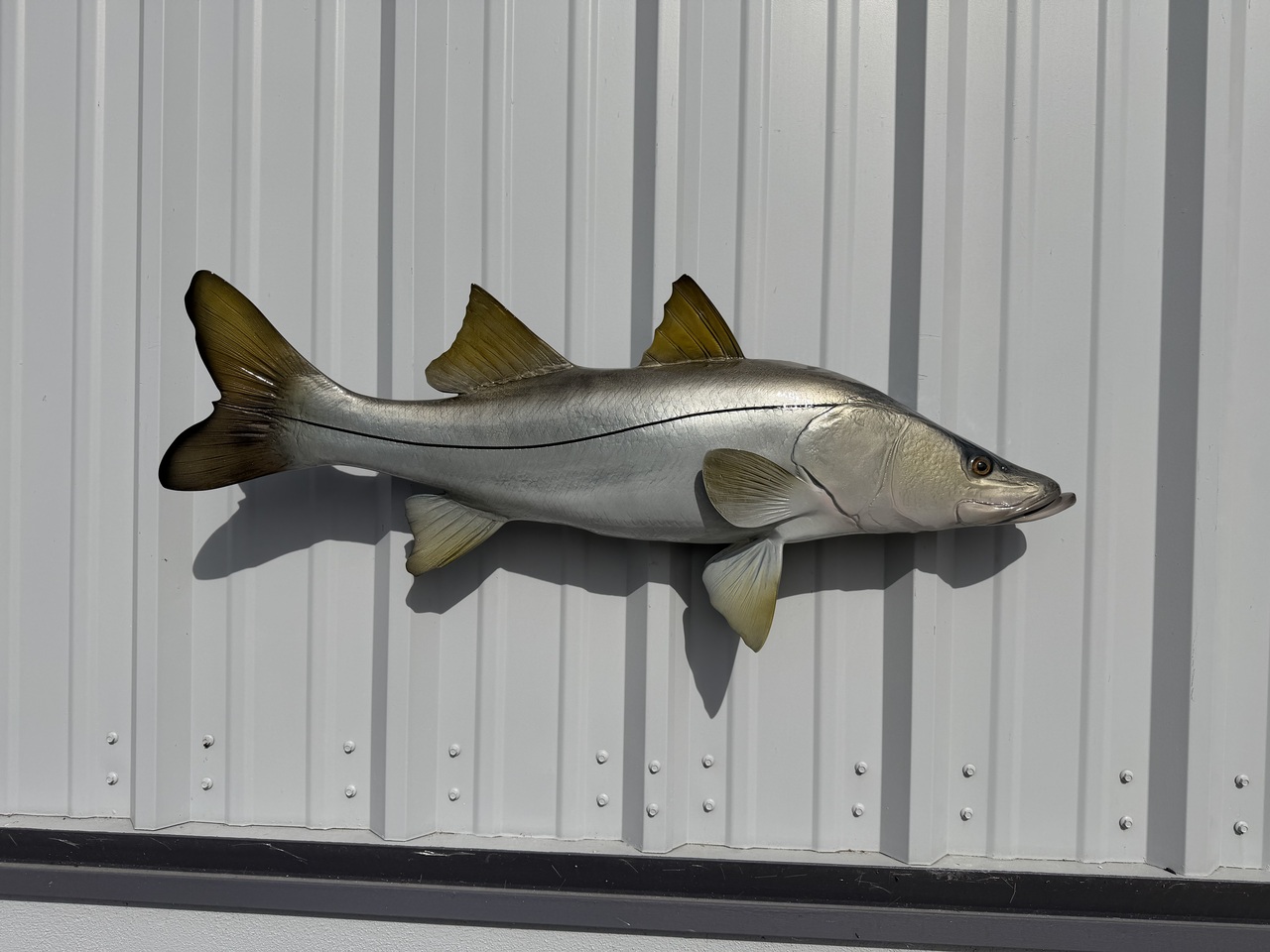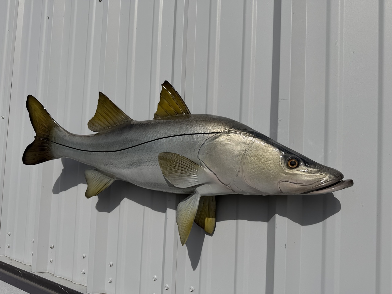 This gorgeous 39" snook full mount is in stock and ready to ship. It is positioned into the traditional form replicating a lazy snook, head into the current and ready to pounce on bait caught in the current. This piece is extremely realistic with the skin texture that was captured during the molding process and an extremely precise and accurate black lateral line. Everything that is viewable when up on all the wall is finished.