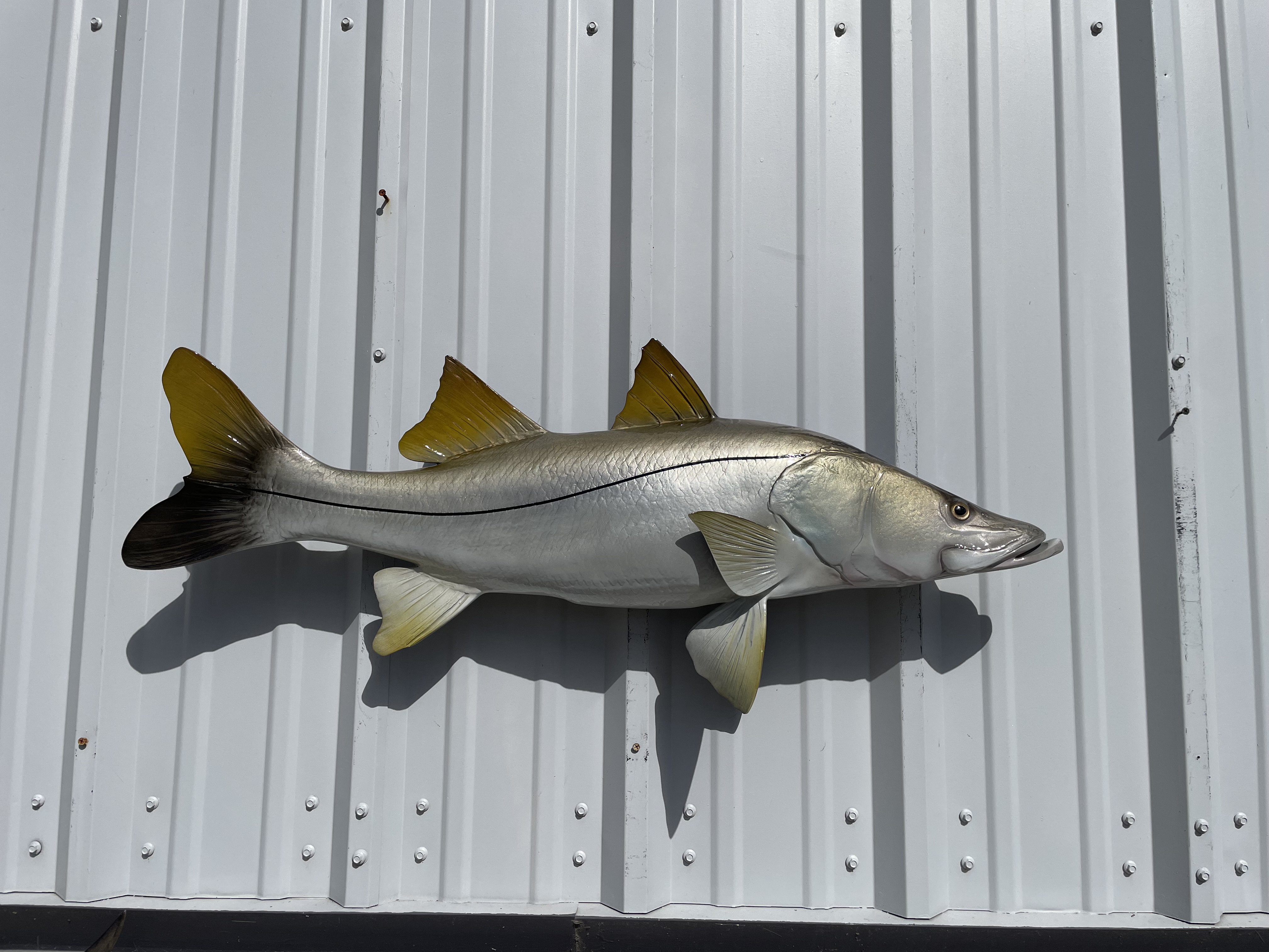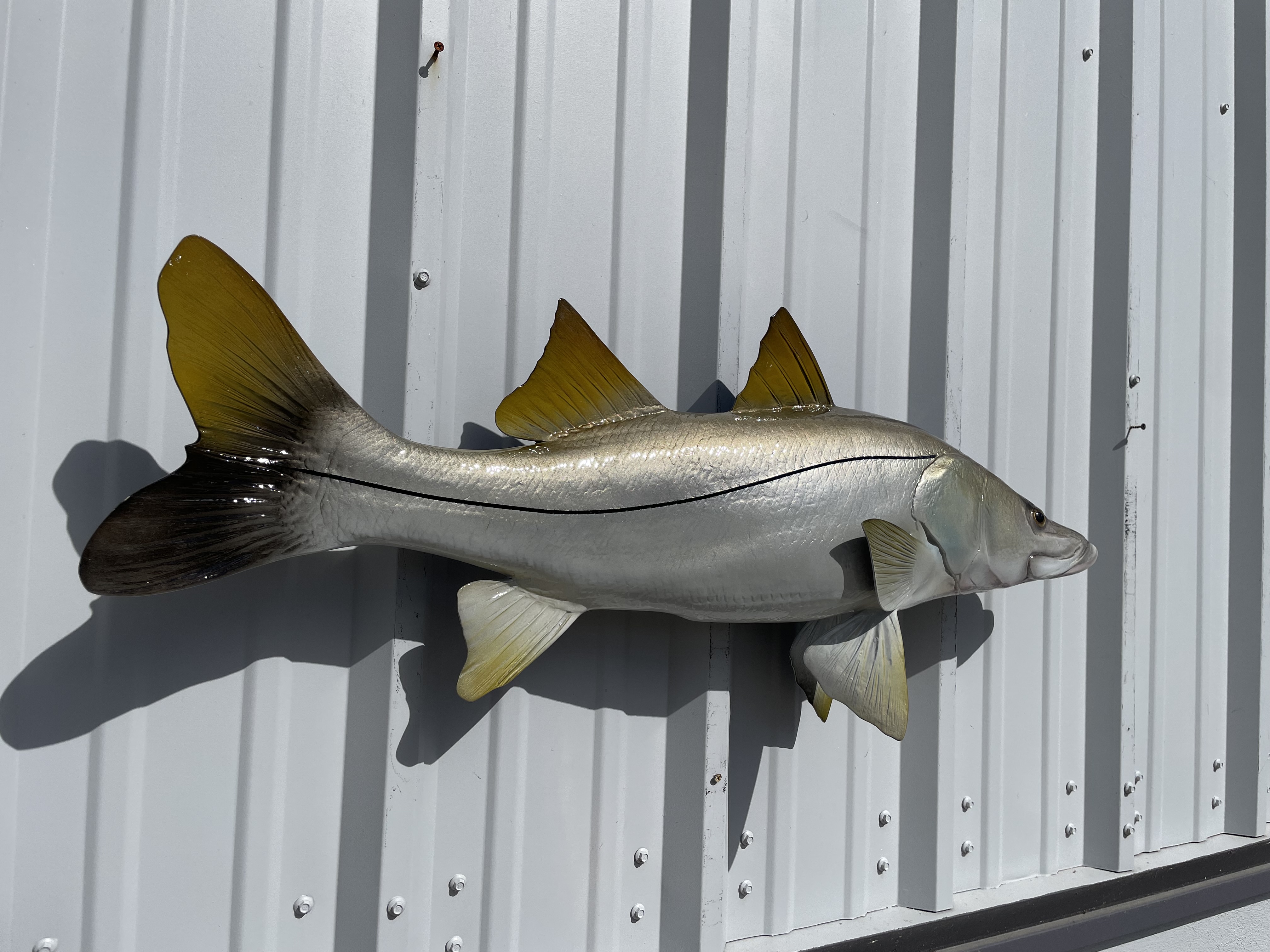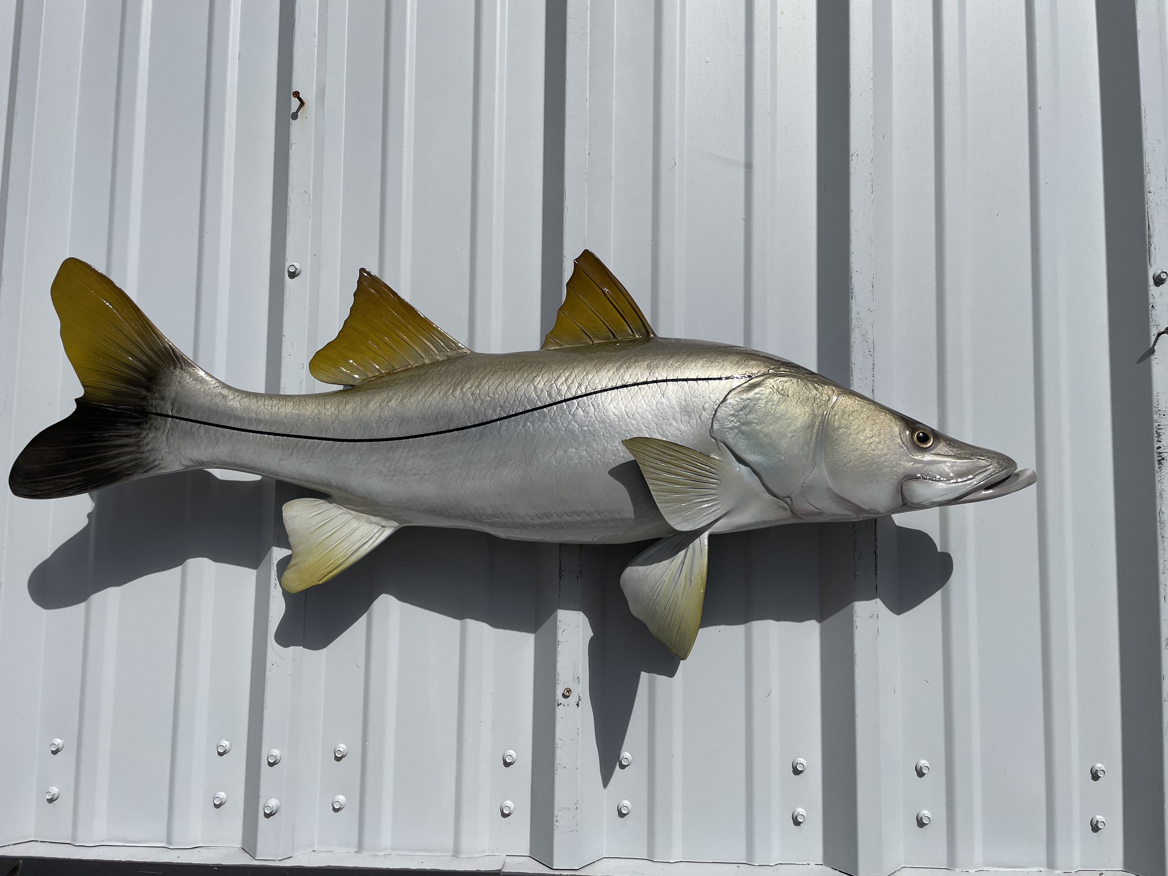 This gorgeous 39" snook full mount is in stock and ready to ship. It is positioned into the traditional form replicating a lazy snook, head into the current and ready to pounce on bait caught in the current. This piece is extremely realistic with the skin texture that was captured during the molding process and an extremely precise and accurate black lateral line. Everything that is viewable when up on all the wall is finished.