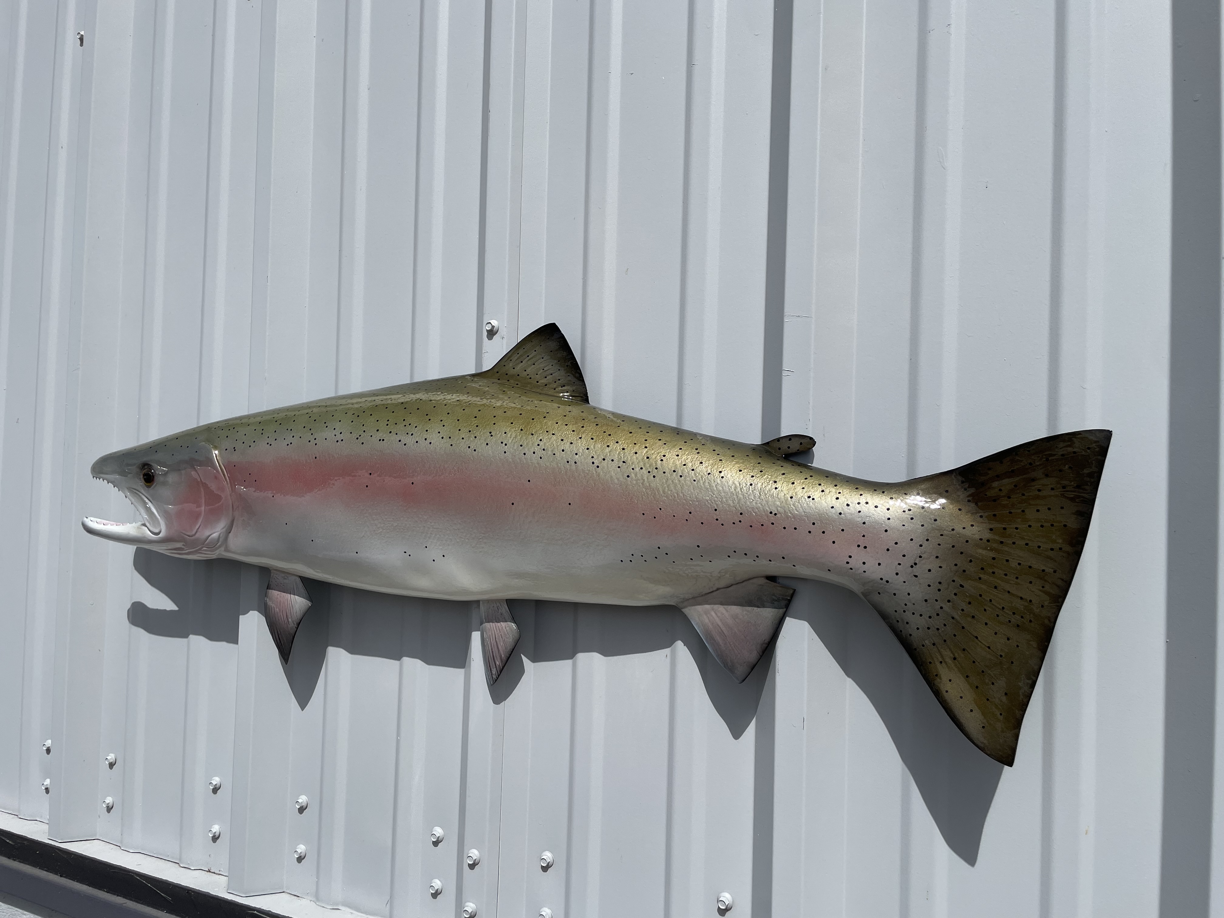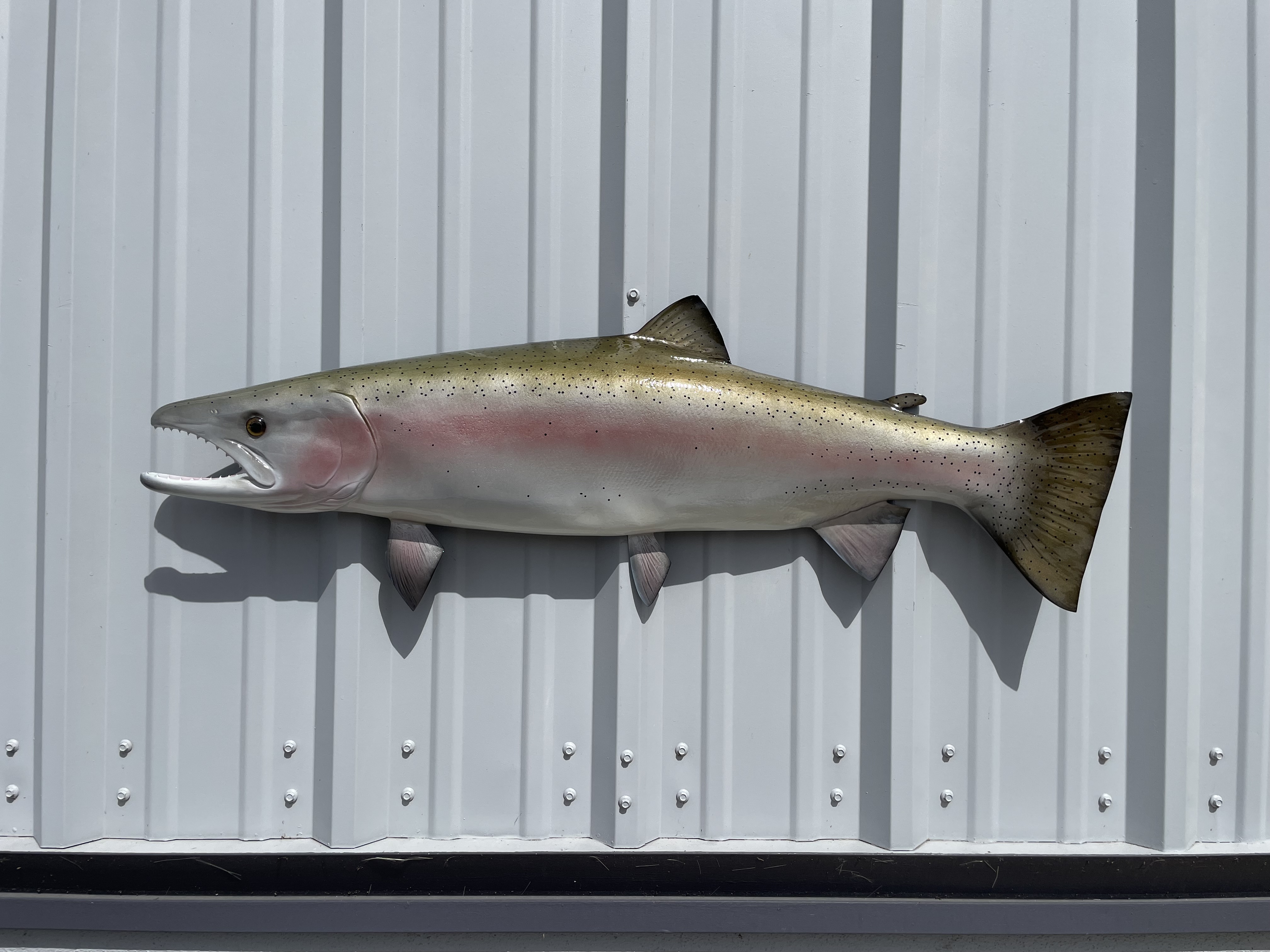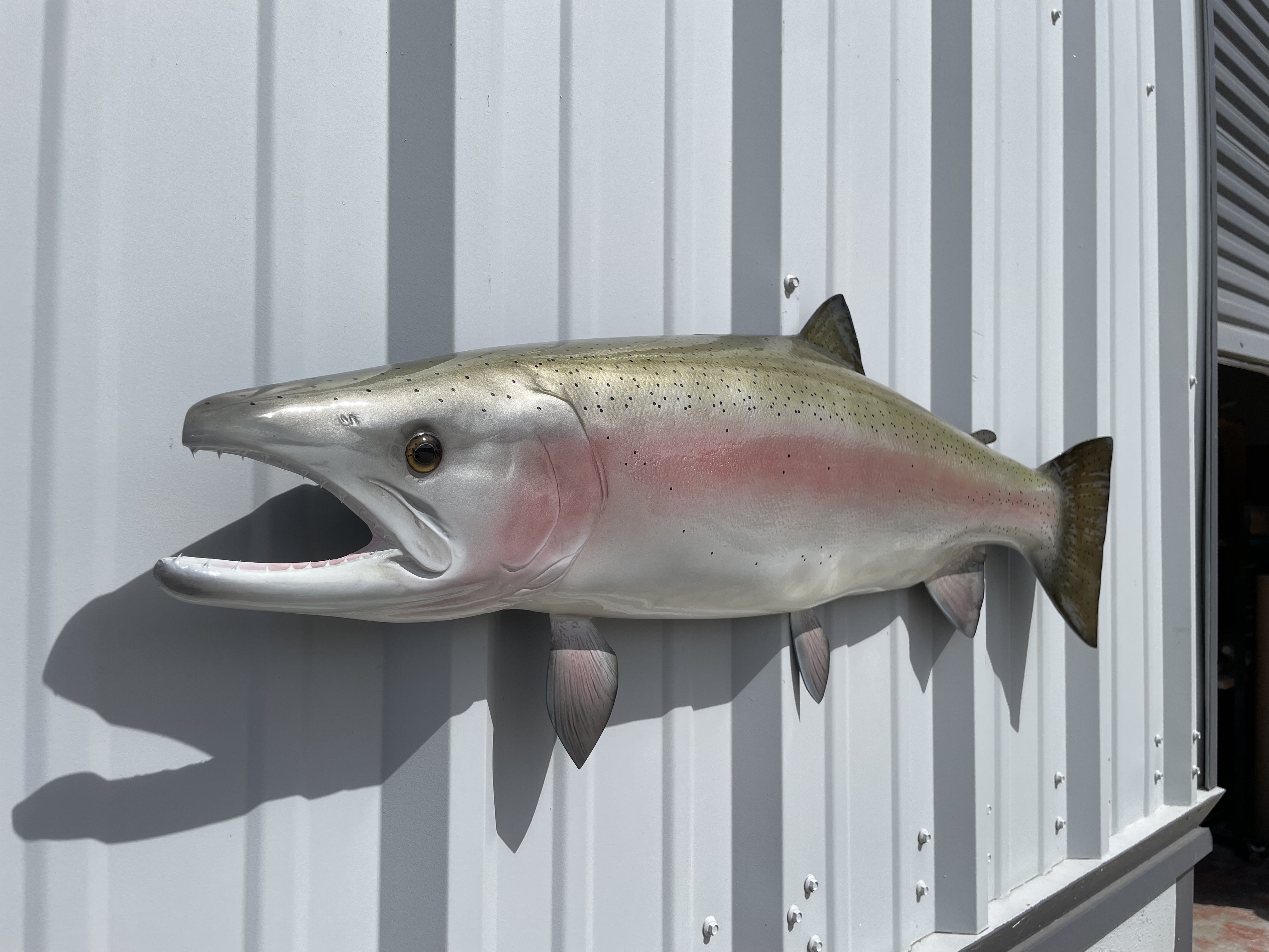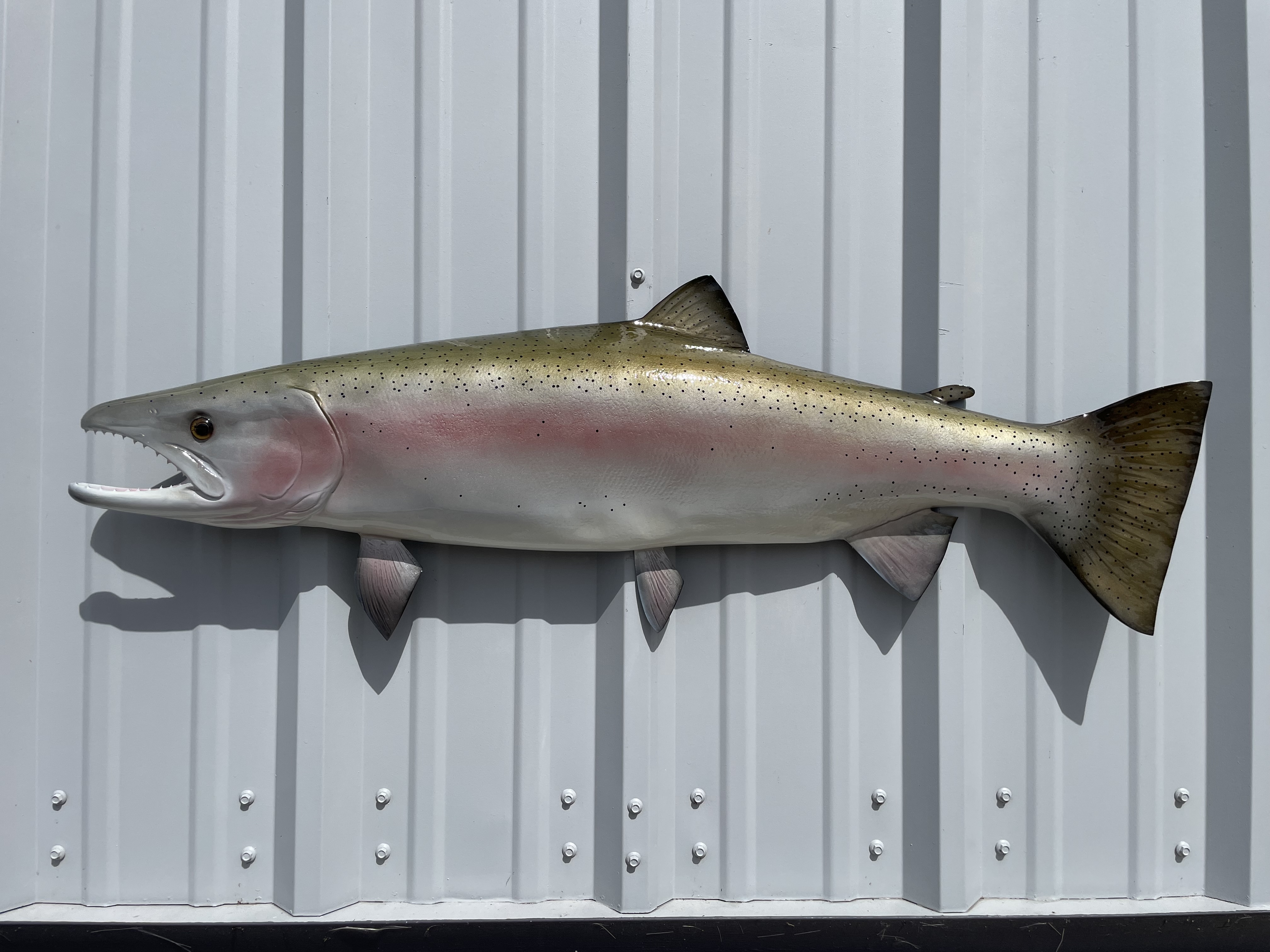 Steelhead trout are commonly found in the ocean but travel into lakes, streams and rivers in across North America during spawning season. They look similar to Rainbow Trout except for the shape of their mouth. Commonly they are caught displaying greenish brown backs with pinkish to reddish sides bands and covered in black spots. Like other fish, Steeleahd Trout can have many different variations of coloring however our standard paint job includes the above mentioned features. The final step of the finishing process is to spray a UV protecting clear coat to give it superior protection indoors or outside. We do not custom paint our half sided series replicas.