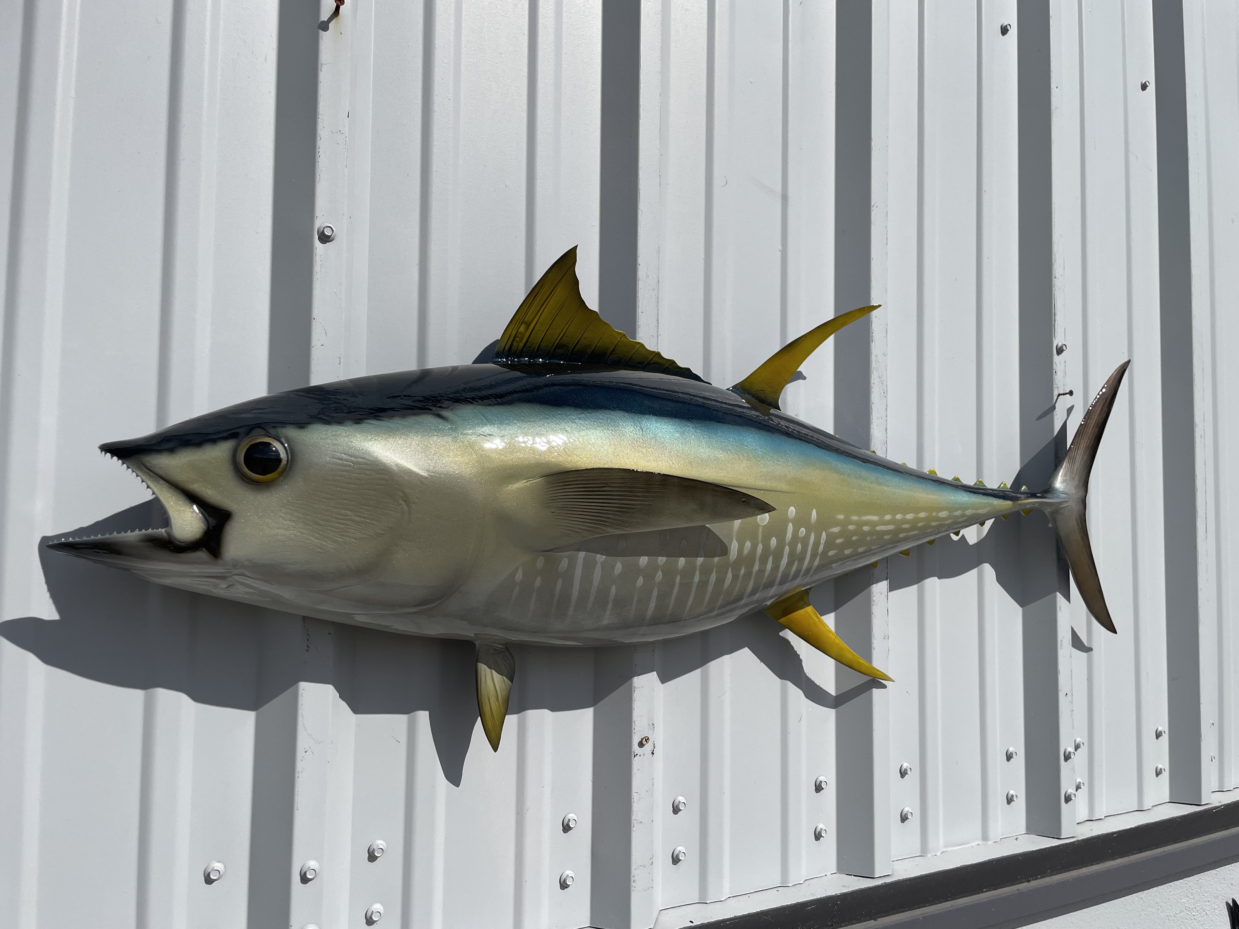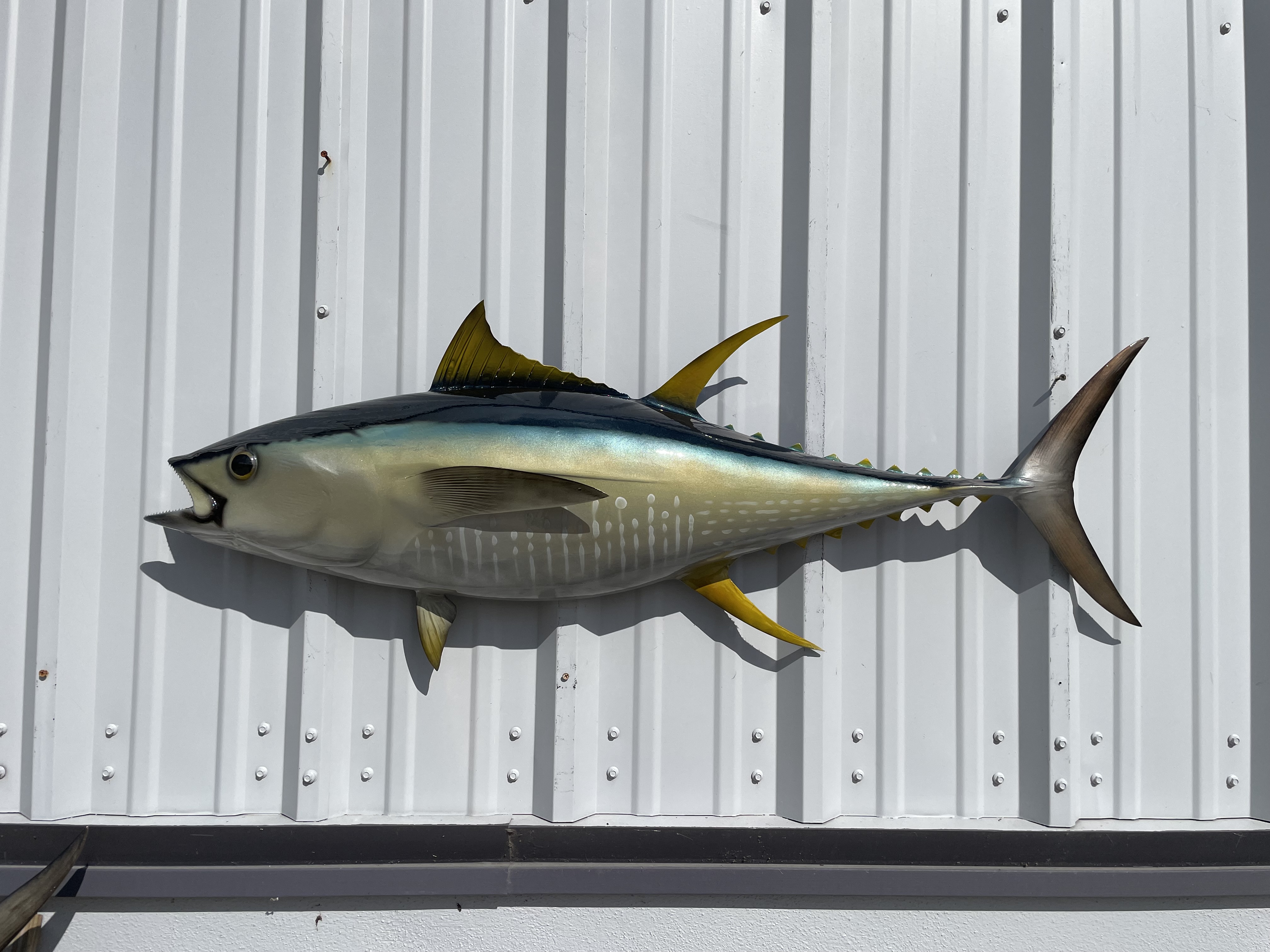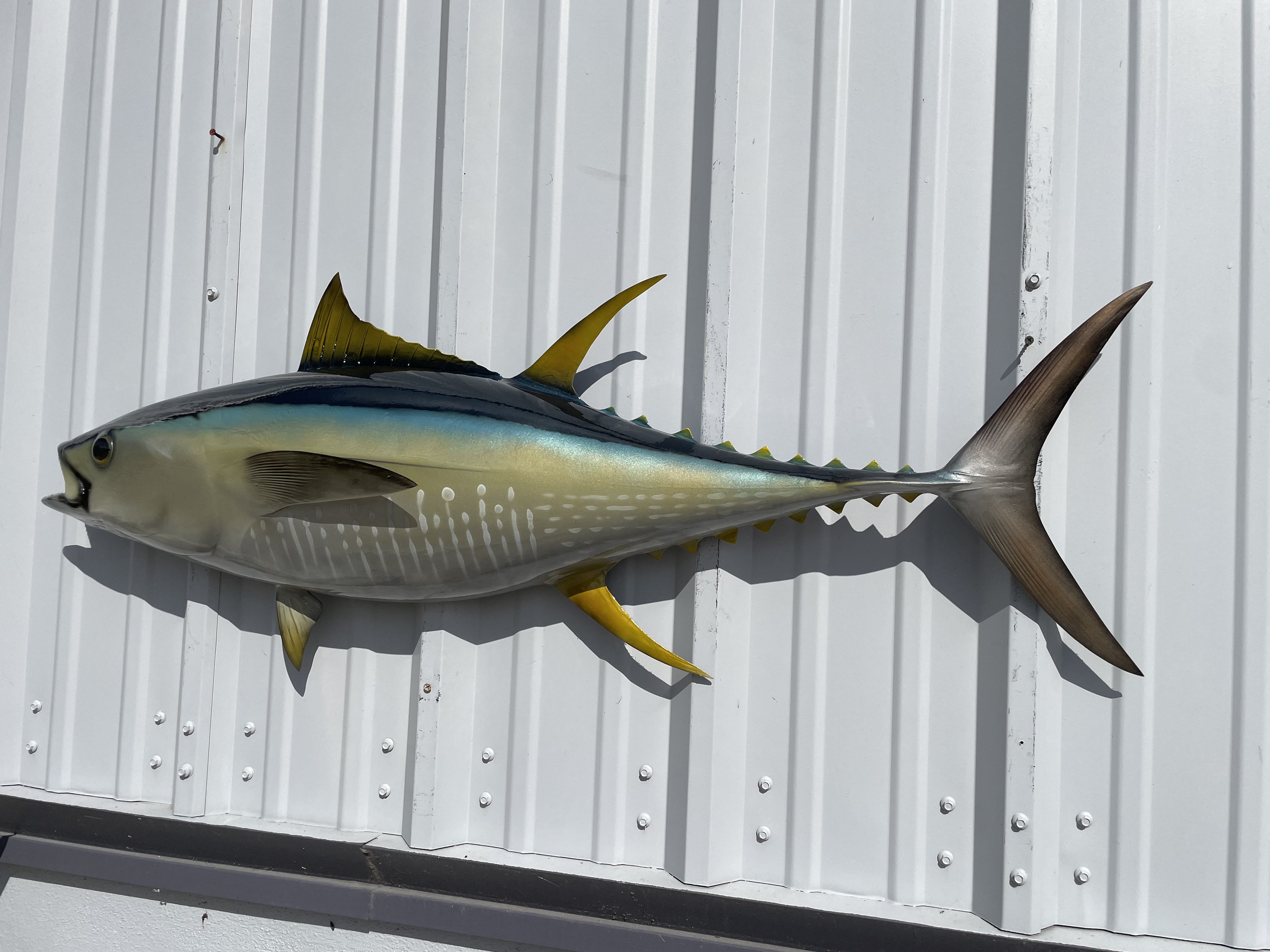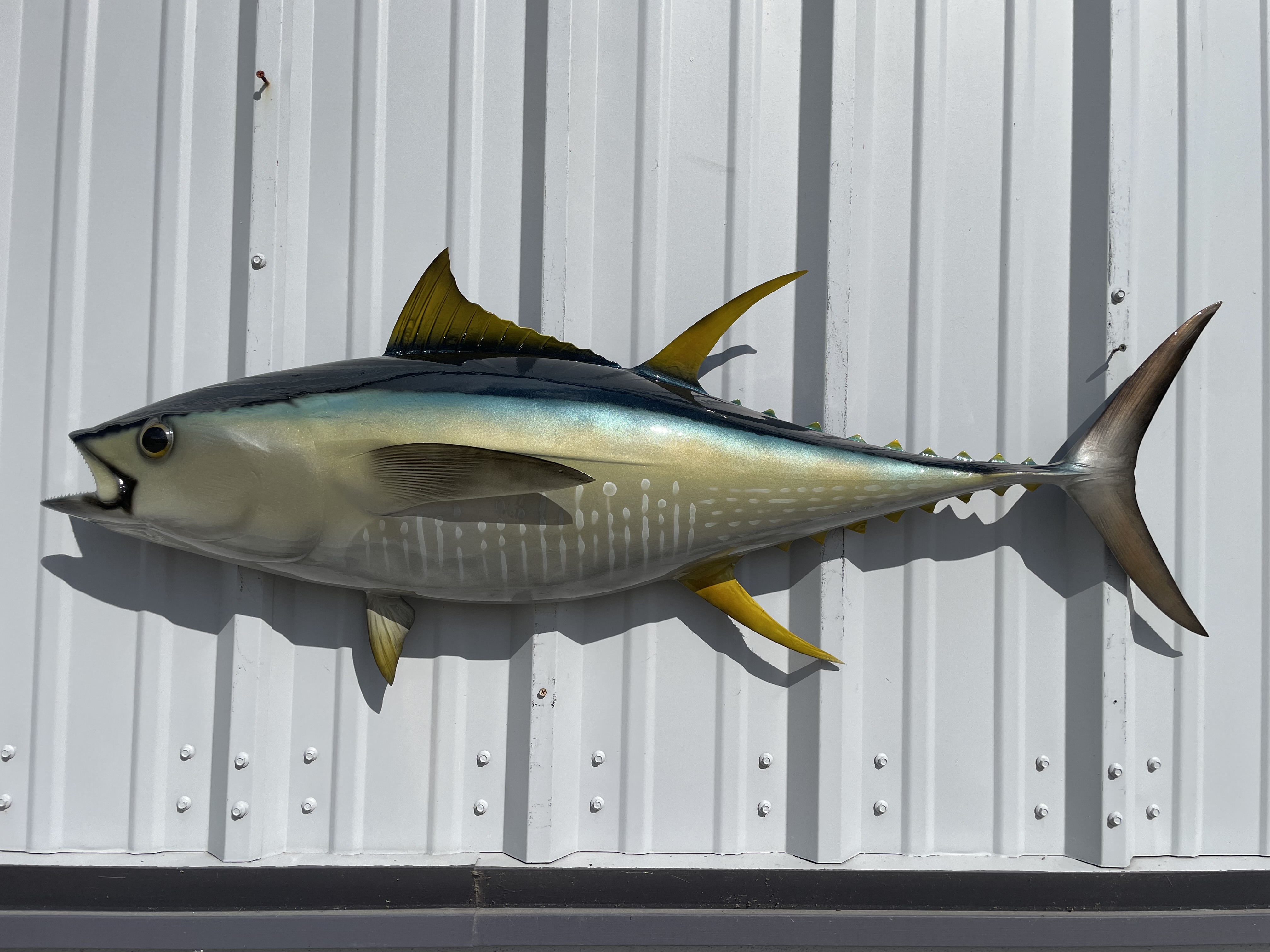 Blue to steel black above, silver to silvery gold on the flanks, silvery white below. In fresh fish a band of bright gold or iridescent blue (sometimes both) runs along the upper flank, separating the dark back from the lighter belly area. Like other fish, yellowfin tunas can have many different variations of coloring however our standard paint job includes the above mentioned features. The final step of the finishing process is to spray a UV protecting clear coat to give it superior protection indoors or outside. We do not custom paint our half sided series replicas.