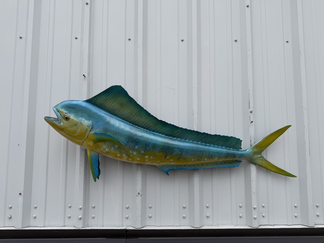 This 51" Cow Dolphin Fish Mount is in stock and ready to ship. This beautiful cow dolphin represents a breeder size mahi mahi navigating the deep blue ocean in search of her next meal. This mold for this cow dolphin fish mount has incredible skin detail aand has captured the tiny scales dolphin fish possess. Dolphin are a sought after gamefish around the world with many different names. In Hawaii they call them Mahi Mahi and over in California and Mexico they are called Dorado while in the Bahamas have all types of names for them based on their aggravation when pulling larger trolling lures and bait in search for marlin. Often called green hornets or maui wowwies these fish crash their baits and create instant havoc as tournament teams real in all their lines to rebait the damaged baits or hooked mahi mahi.