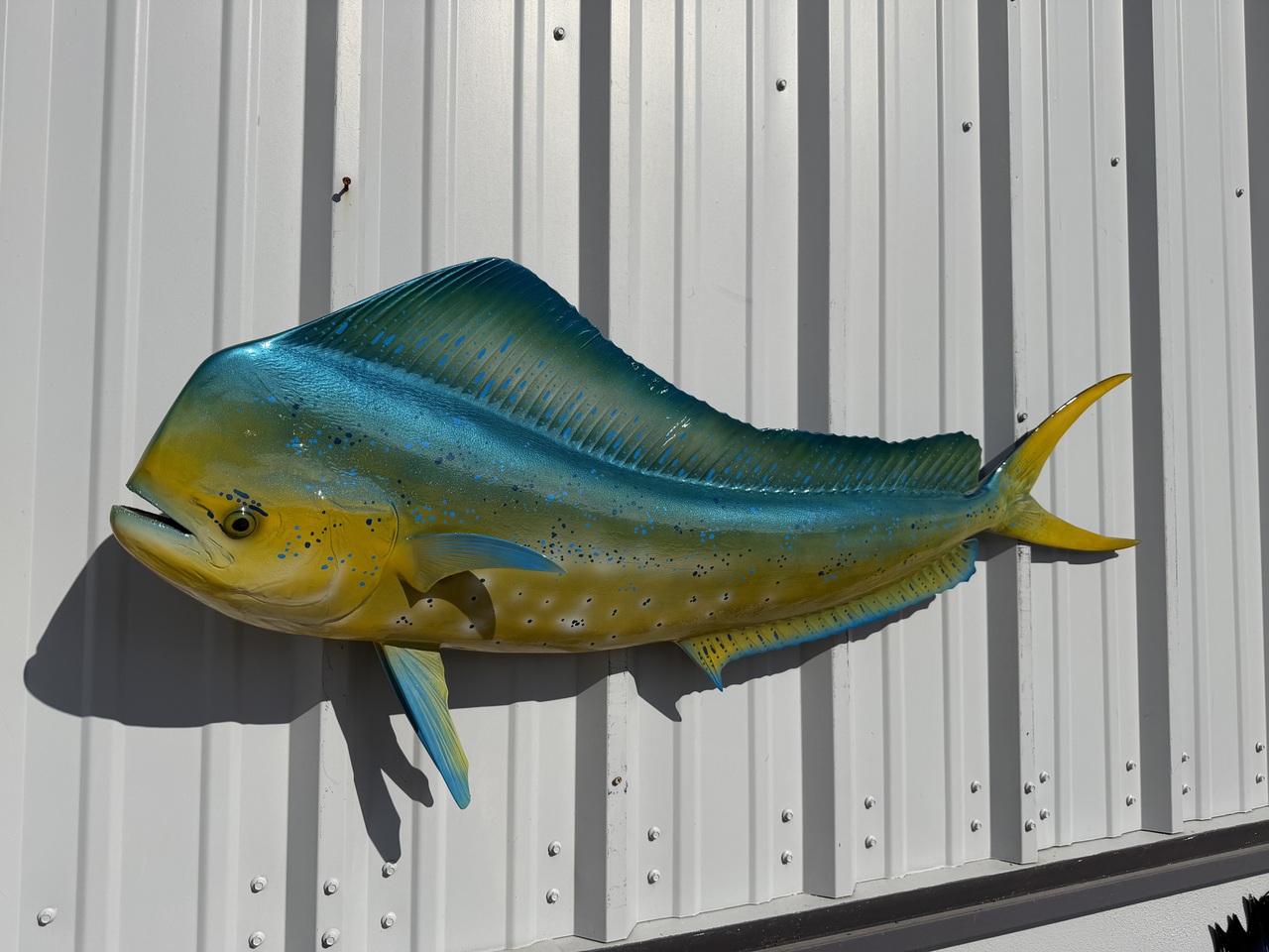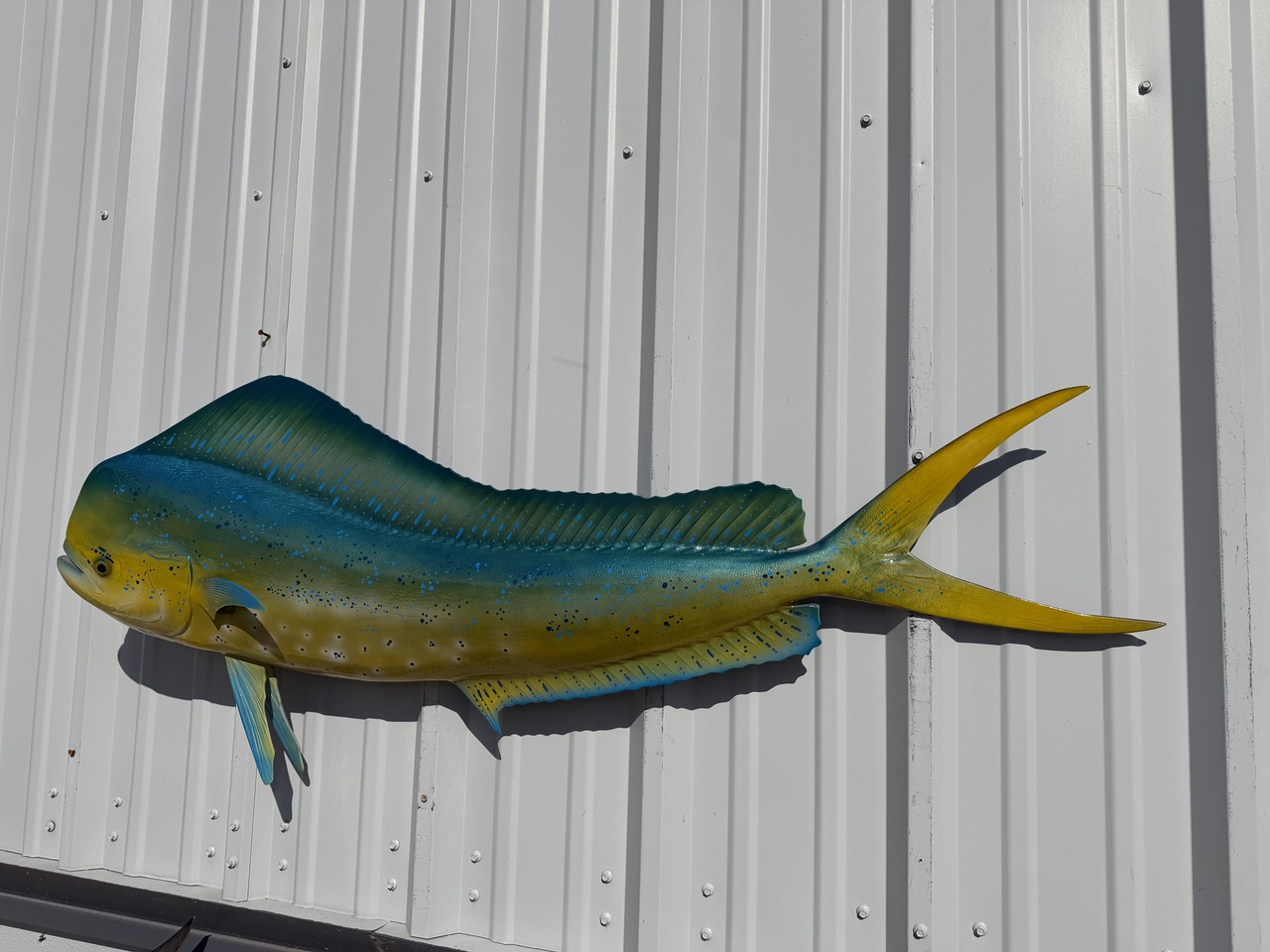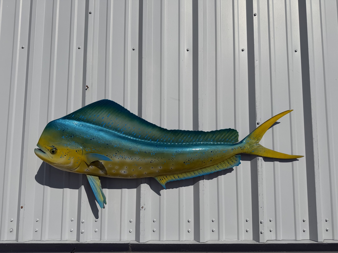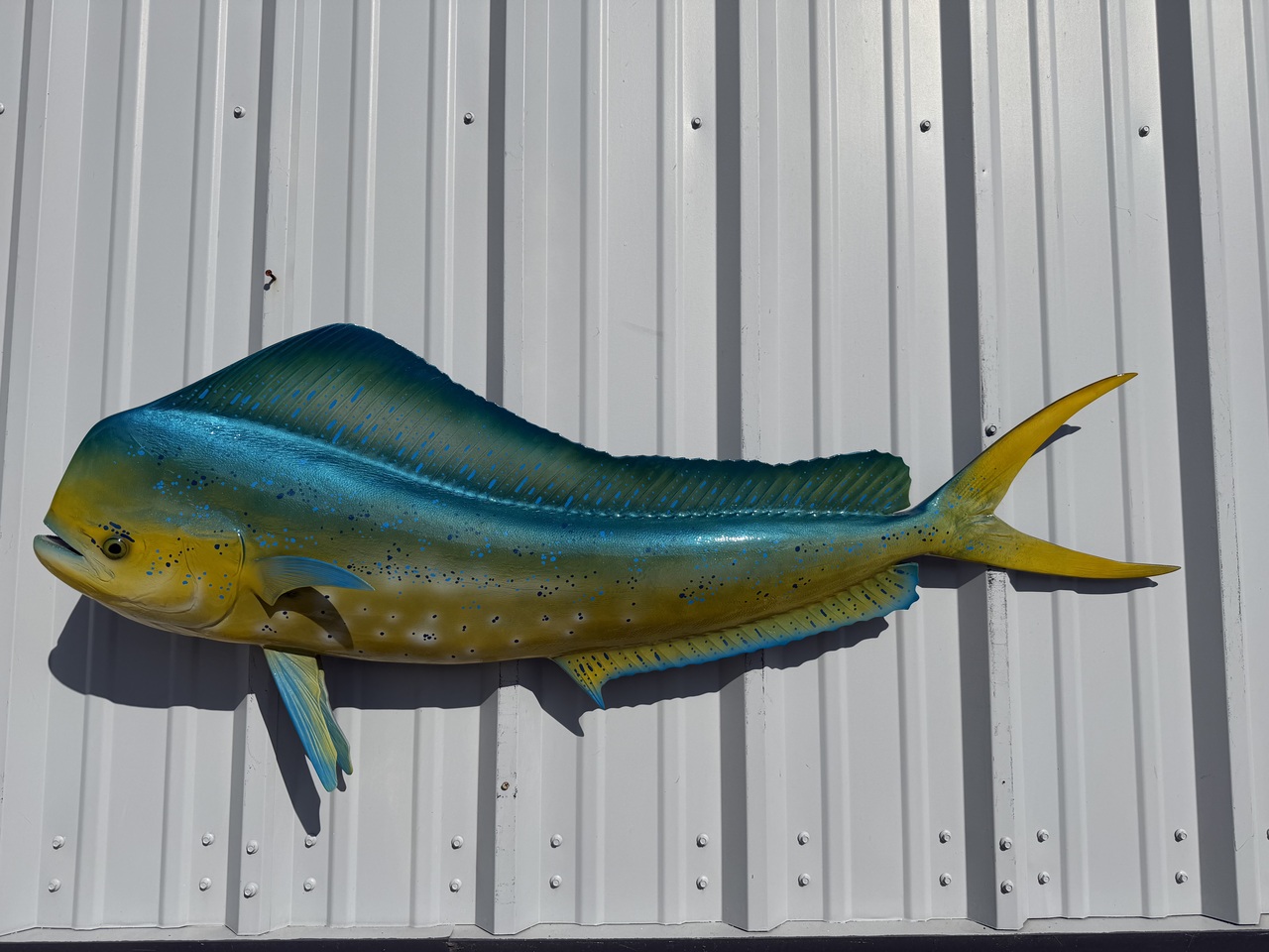 This gorgeous 53" Bull Dolphin full mount is in stock and ready to ship. These pictures are of the actual fish you will receive. This piece is extremely realistic, including custom painted eyes on both sides of the head, artificial mouth gum line texture and skin texture that was captured during the molding process. Everything that is viewable when up on all the wall is finished.