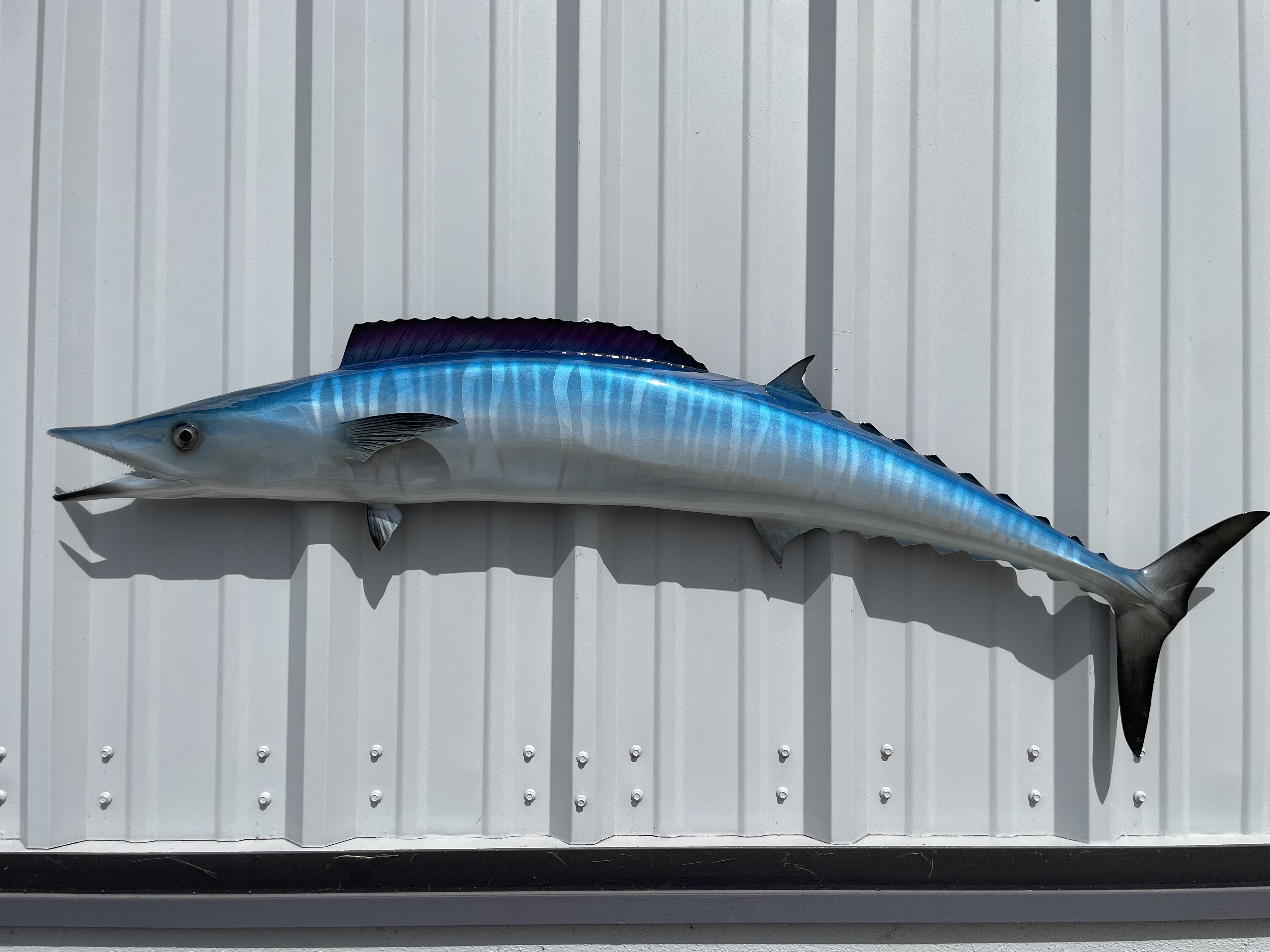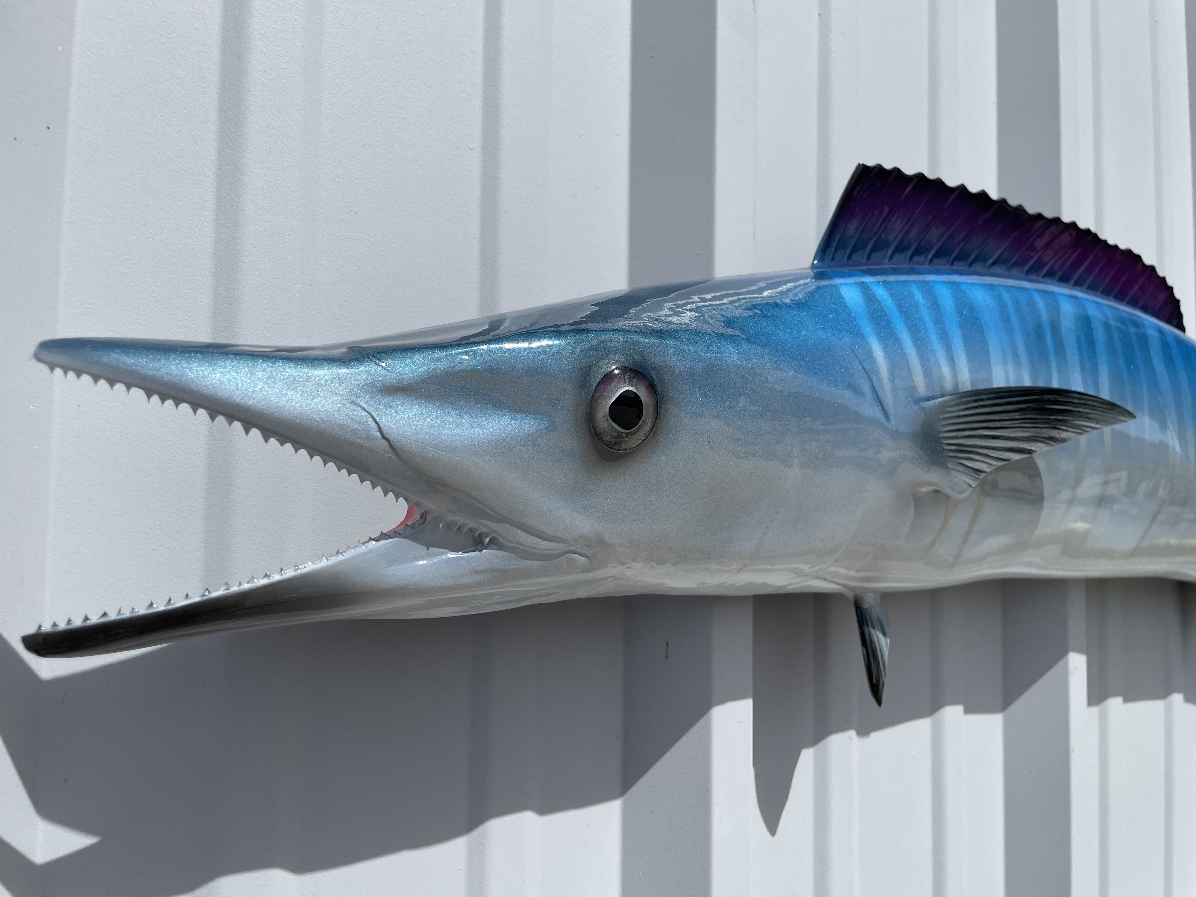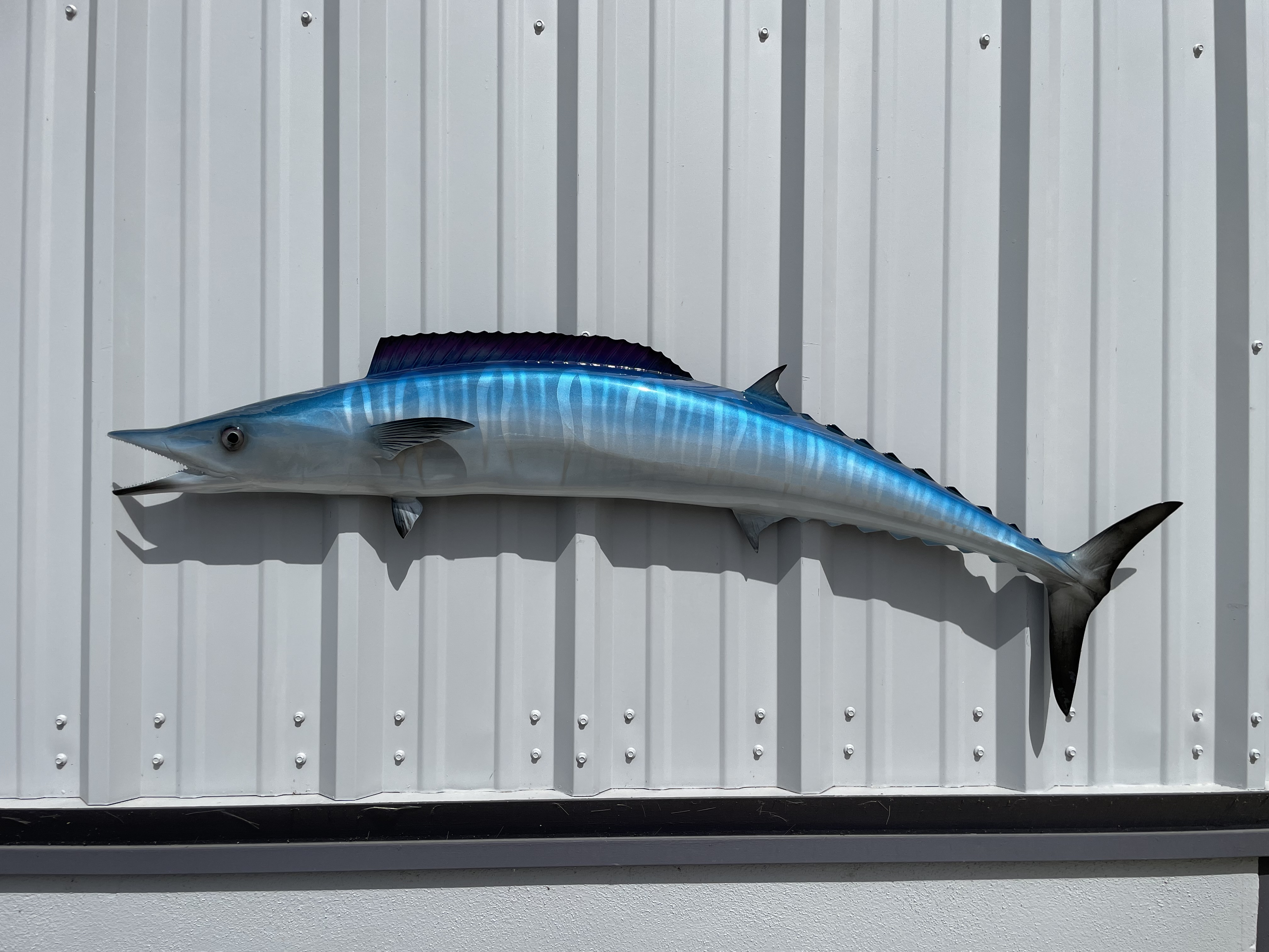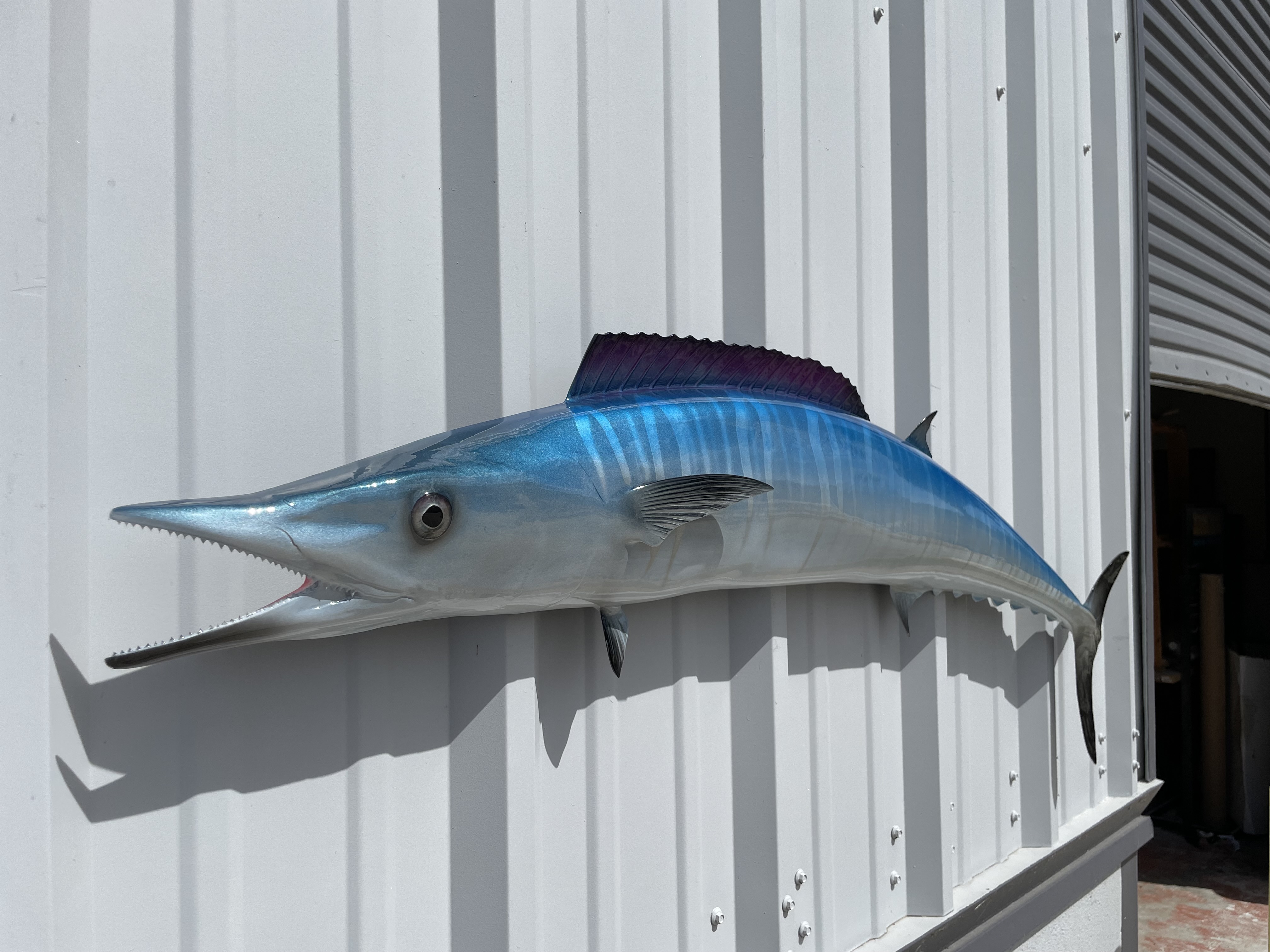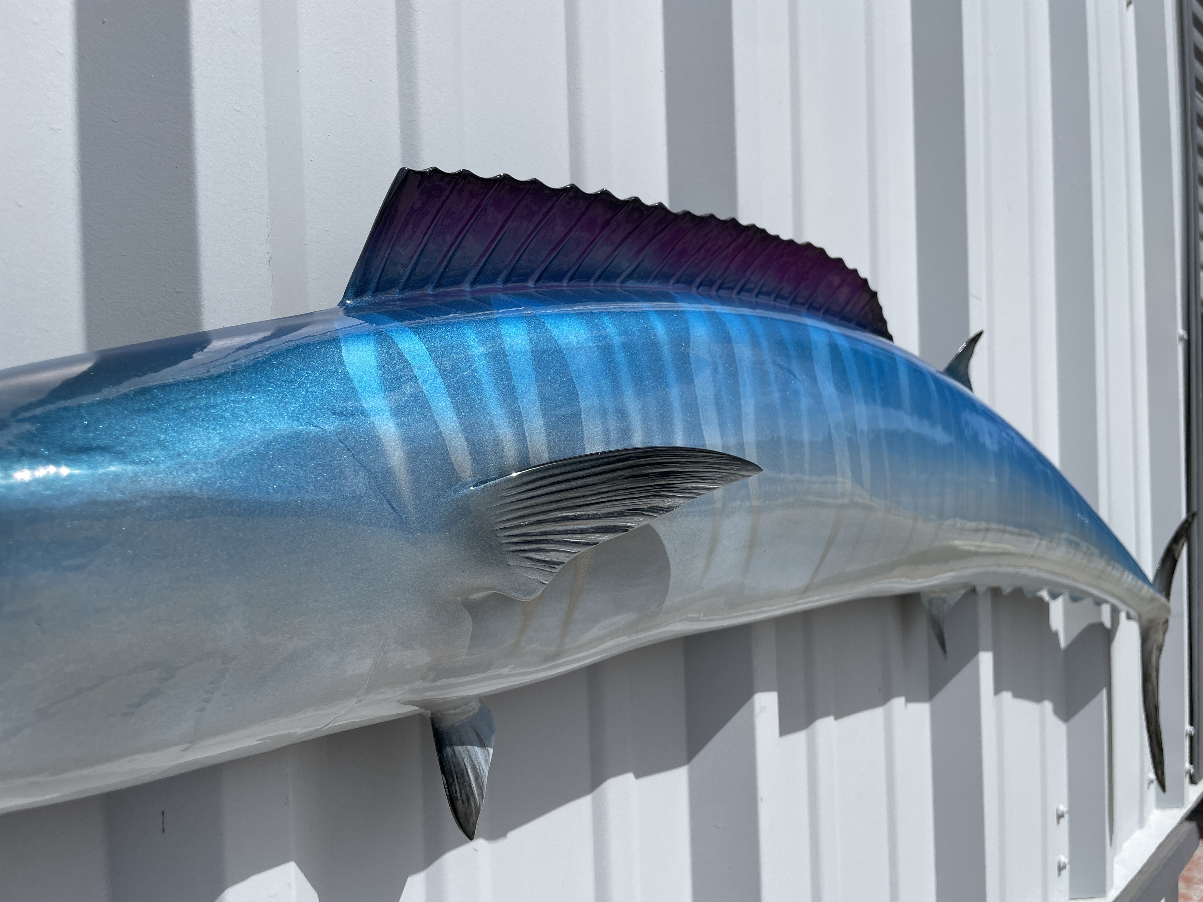 Wahoo are a highly sought after gamefish. Like other fish, wahoo can have many different variations of coloring however our standard paint job includes iridescent blue and silvery body with blue vertical bars. The final step of the finishing process is to spray a UV protecting clear coat to give it superior protection indoors or outside. We do not custom paint our half sided series replicas.