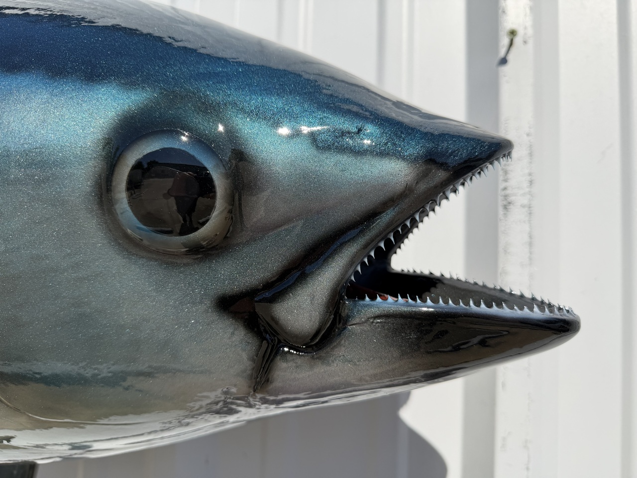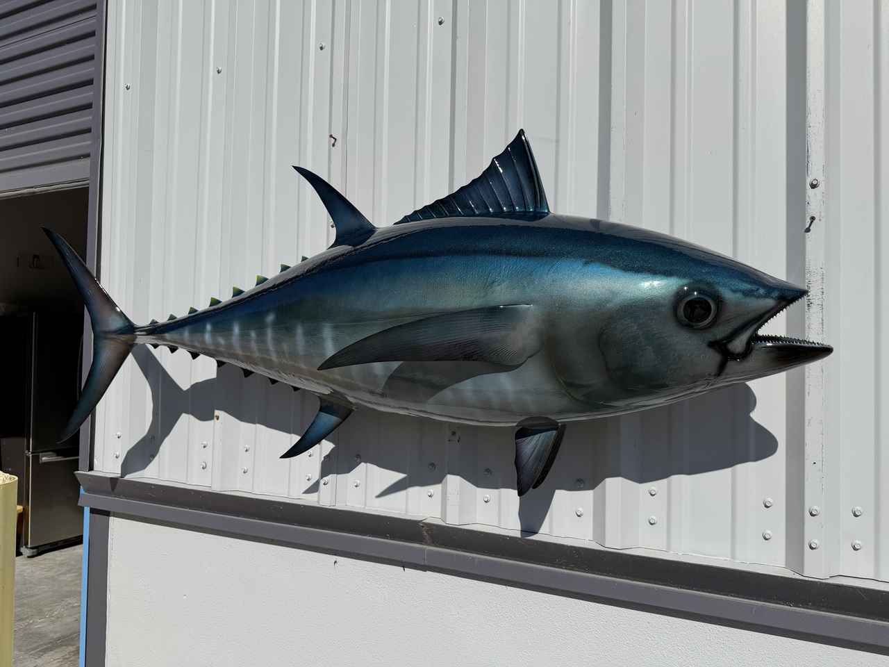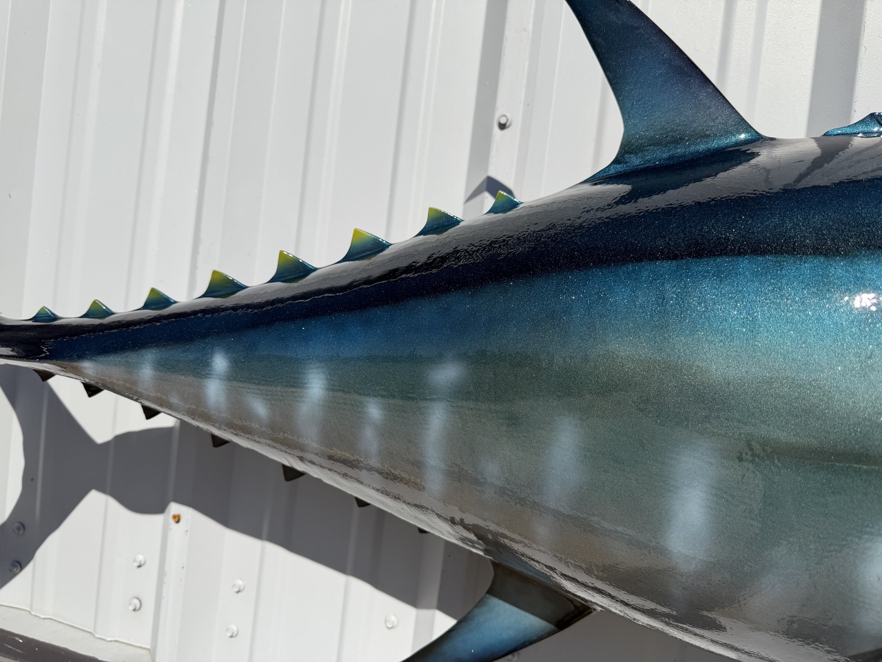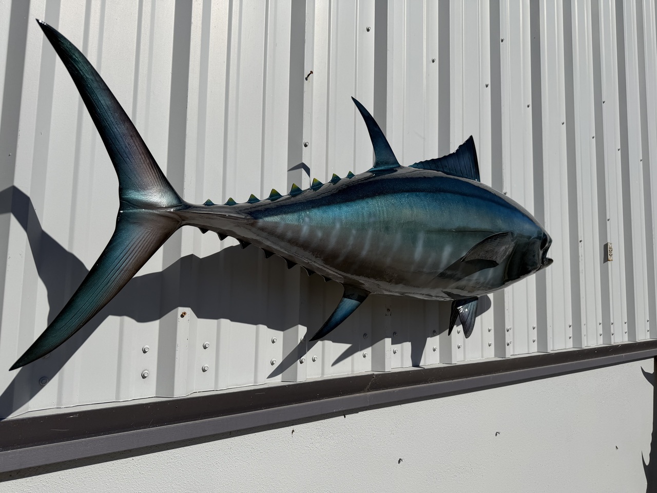 This Bluefin tuna was produced to replicate the fish alive and lit up looking as if it was swimming in the ocean. It was painted our normal process is to paint blue to steel black above, light blue to silver flank, silvery below with light white markings on the belly. The final step is to clear coat the bluefin tuna with a UV Protectant Urethane clear coat, allowing you to display your new tuna fish replica indoors or outside. We do offer an outdoor bracket for installation in areas that might have high wind or potential to get bumped.
