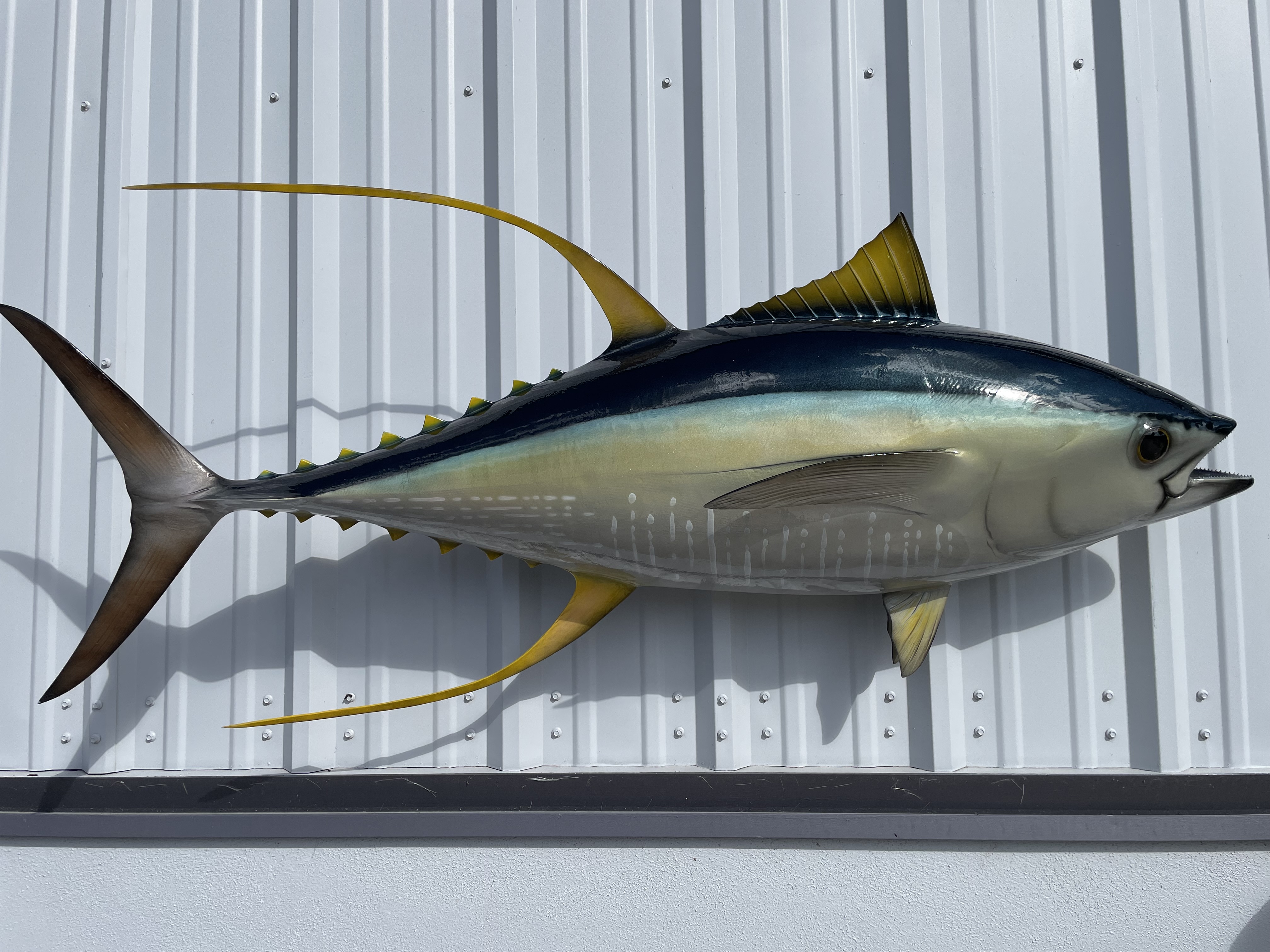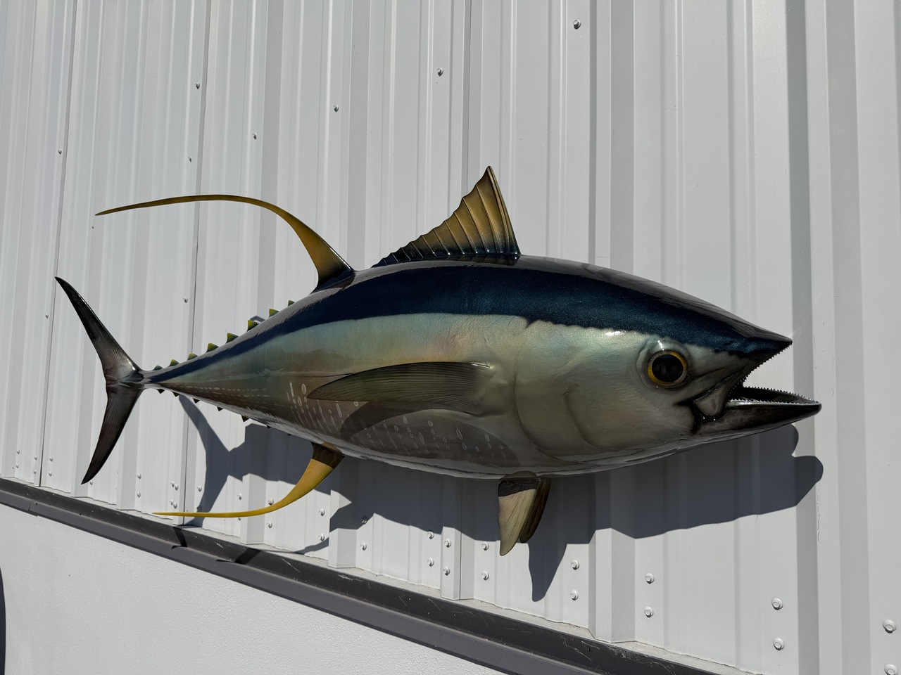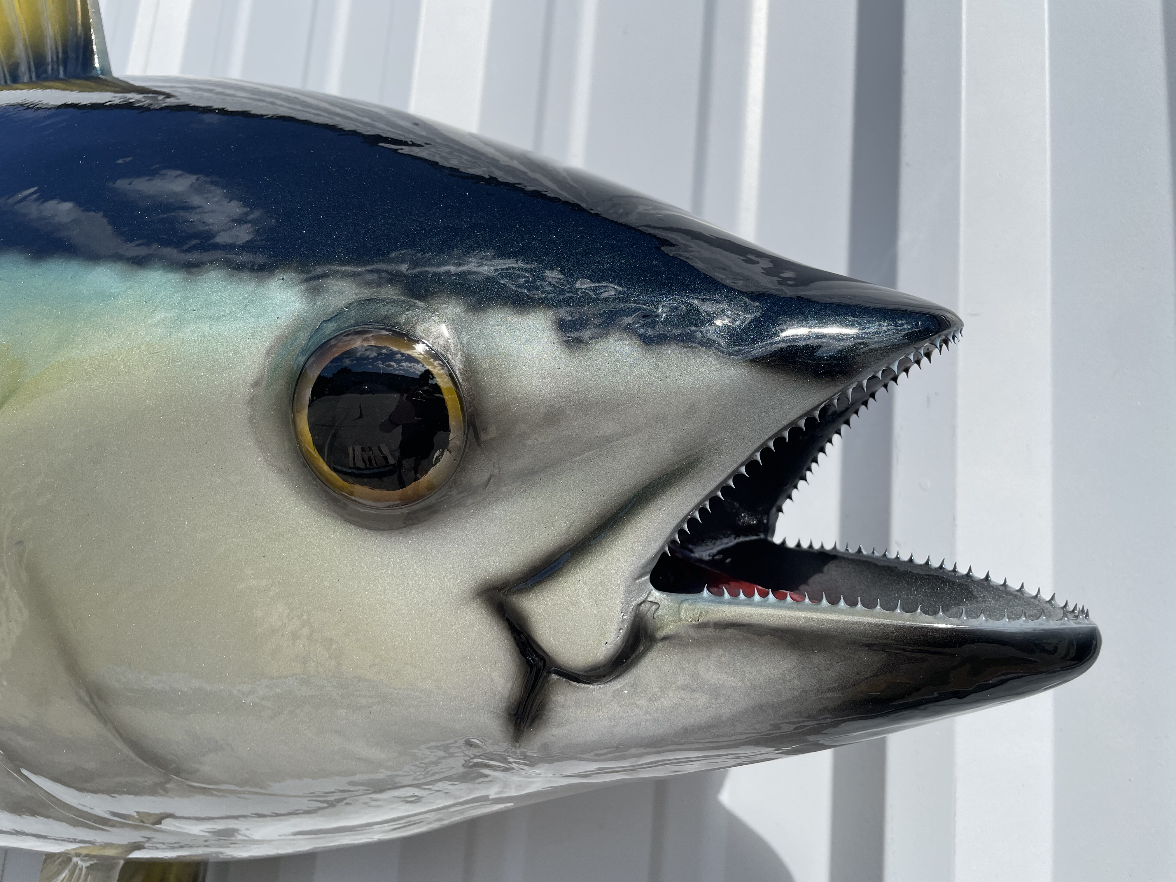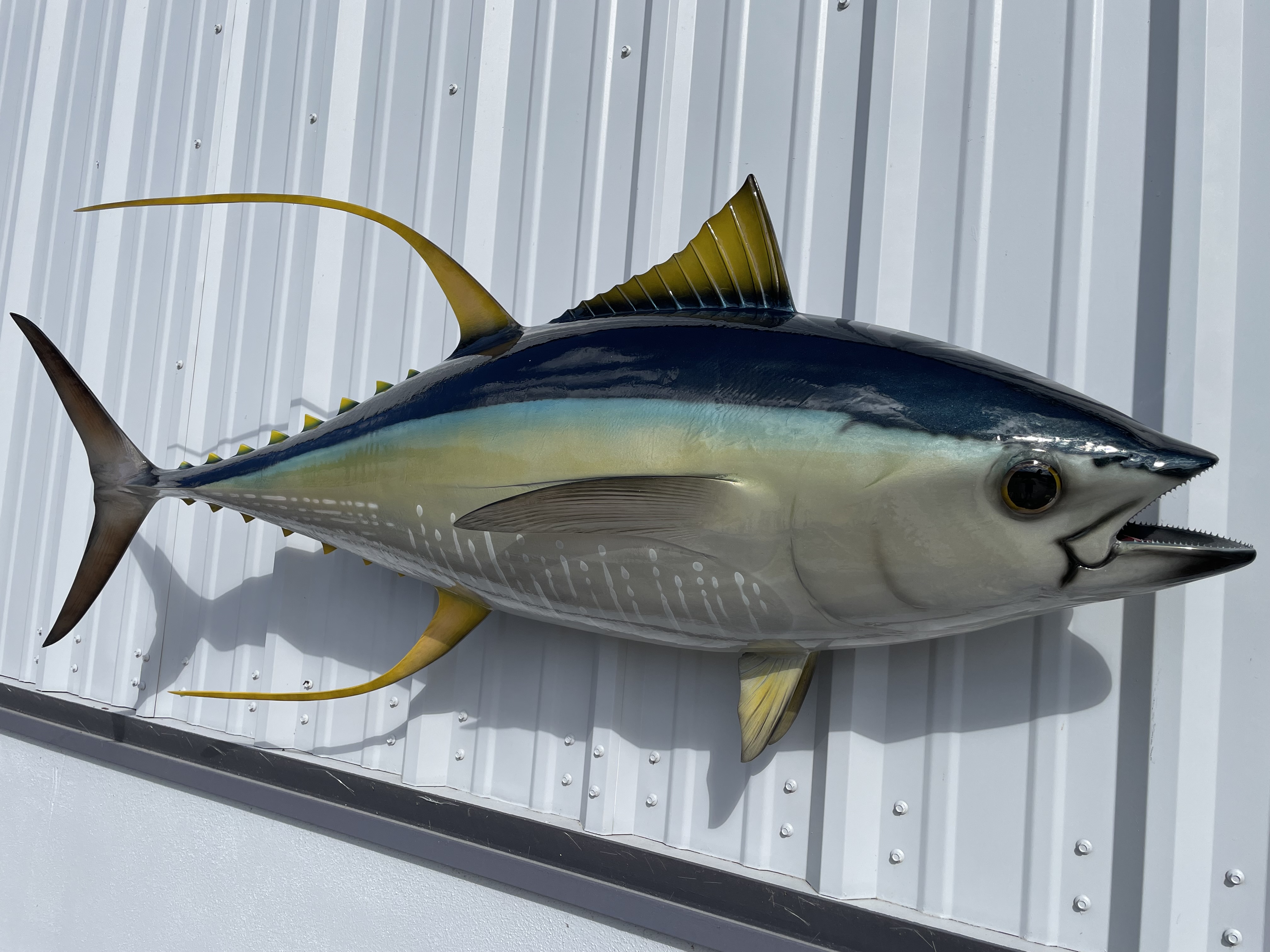 This Yellowfin tuna was produced to replicate a yellowfin swimming in the ocean ready to pounce on your sea witch. This color scheme is our normal process which is to paint blue to steel black above, silver to silvery gold on the flanks, silvery white below. A fresh fish a band of bright gold and yellow or iridescent blue (sometimes both) runs along the upper flank, separating the dark back from the lighter belly area. The final step is to clear coat the yellowfin tuna with a UV Protectant Urethane clear coat, allowing you to display your new tuna fish replica indoors or outside. We do offer an outdoor bracket for installation in areas that might have high wind or potential to get bumped.