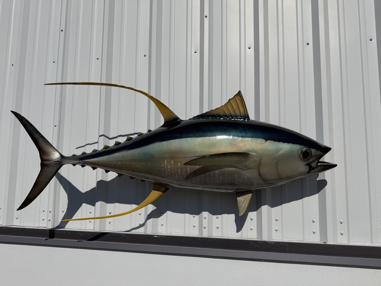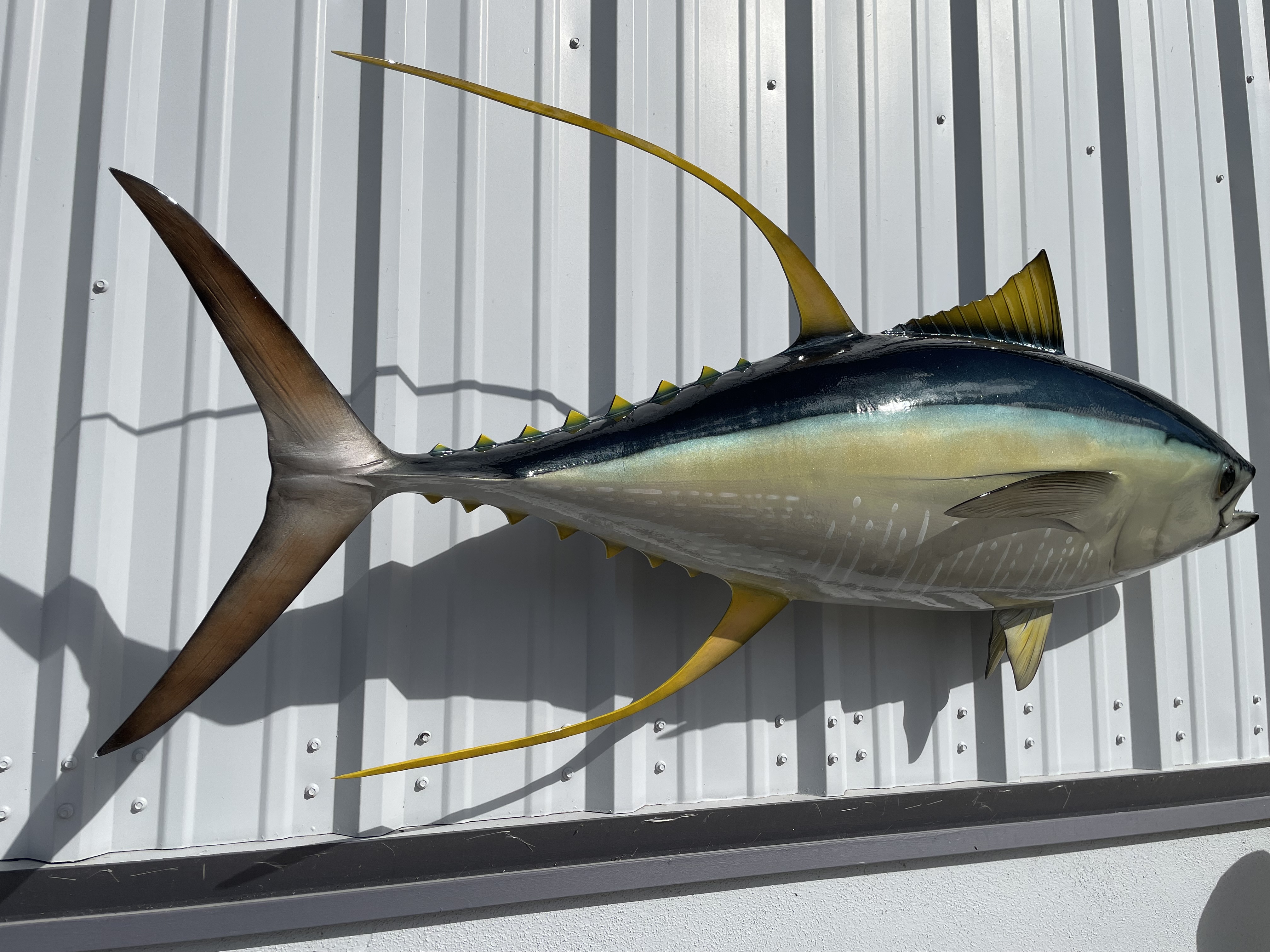This majestic 62" Yellowfin Tuna Fish Mount is in stock and ready to ship. Yellowfin Tuna fish replica, which we call a two sided wall mount, is extremely realistic, including a custom painted eye (or eyes if you choose backside eye) and incredibly detailed skin texture that was captured during the molding process. Everything that is viewable when up on all the wall is finished. Yellowfin Tunas are known for their exploding, arial strikes on baits and their delicious table fair. Yellowfin Tuna are a highly migratory species and can be found throughout the Pacific and Atlantic Oceans and into the Caribbean waters. Yellowfin Tuna fish replicas are anatomically correct fish mounts that are intended to be displayed on the wall. The backside of the fish mount that is touching the wall or not viewable is actually painted black. These two sided wall mounts are not intended to be hung from the ceiling.