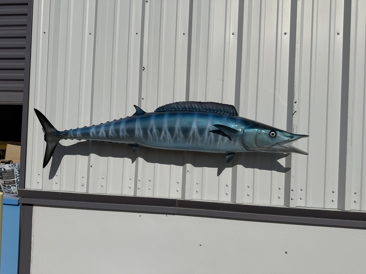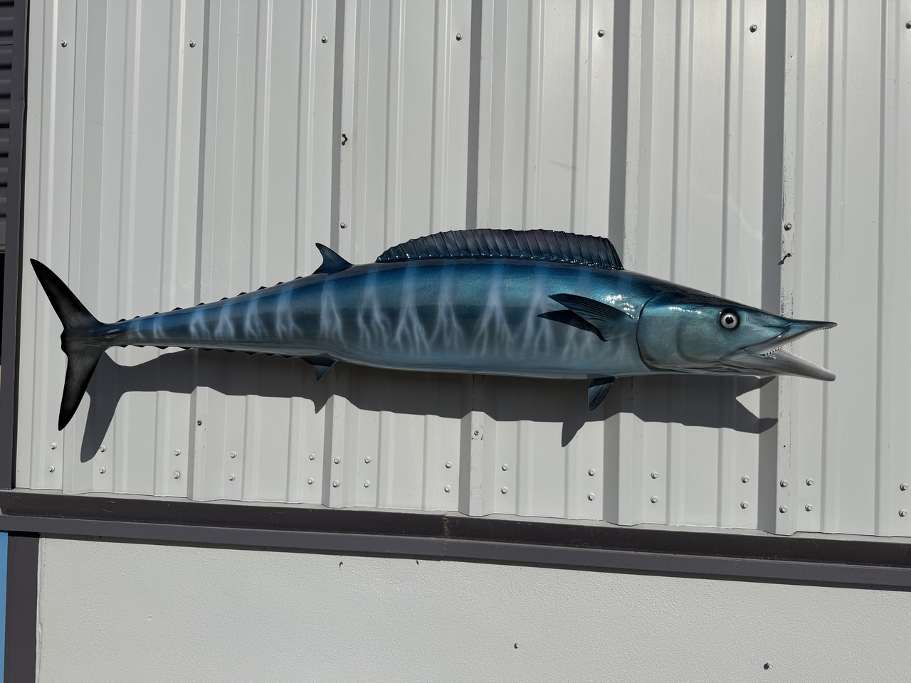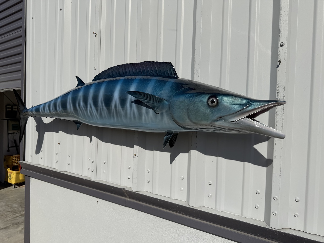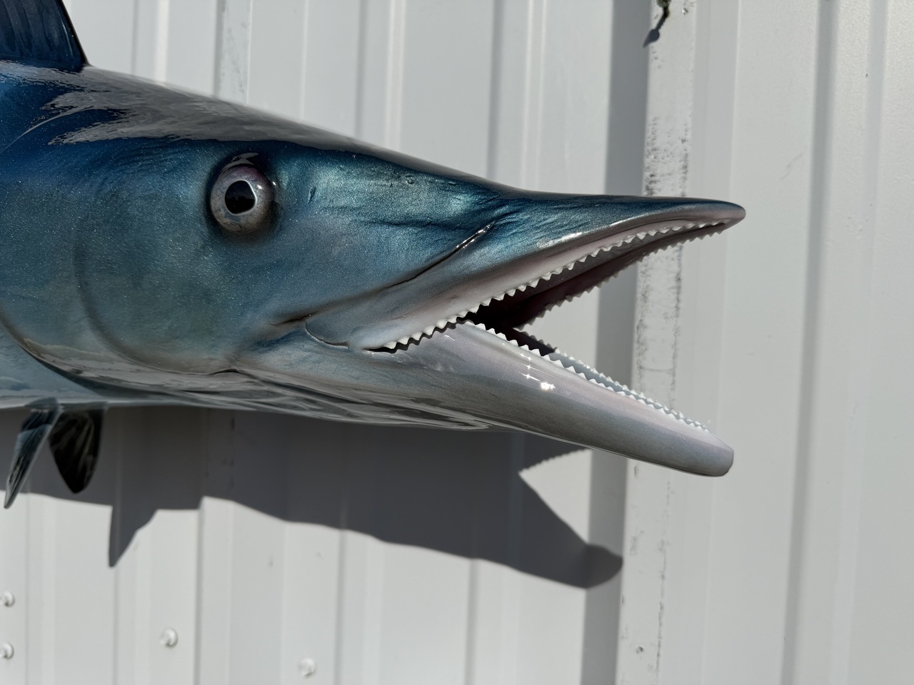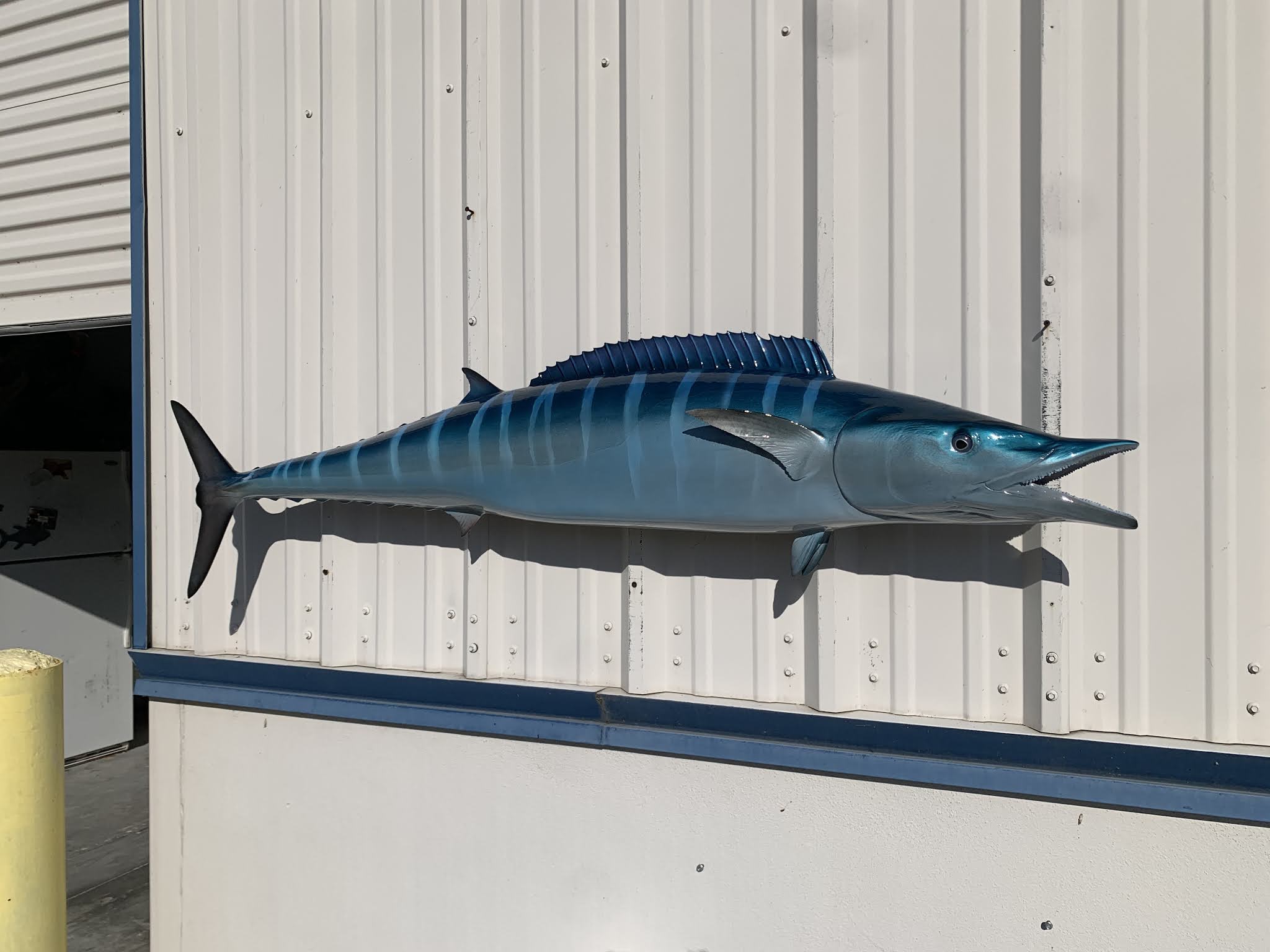 This 63" Wahoo Fish Mount is in stock and ready to ship. This piece is extremely realistic, including custom painted eyes on both sides of the head, and skin texture that was captured during the molding process. The wahoo was posed in this classic downward position with its mouth and gill open making this 48 inch wahoo a beautiful display. The images you see within this description and above are pictures of the actual wahoo fish mount you will receive if you order this item. Wahoo is also commonly called Ono, especially in the sushi trade and in Hawaii. Wahoo's are extremely fast predators that crash their prey at lightning speeds.