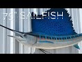 This 75" Atlantic Sailfish full mount, which we call a two sided wall mount, is extremely realistic with a textured bill and skin texture that was captured during the molding process. Everything that is viewable when up on all the wall is finished. Atlantic Sailfish are one of the Atlantic Ocean's fastest gamefish and are sought after for the sport of catch and releasing. Many tournaments are organized with payouts going to the teams that can catch and release the most sailfish. Our Atlantic Sailfish full mounts are anatomically correct fish mounts that are intended to be displayed on the wall. The backside of the fish mount that is touching the wall or not viewable is actually painted black. These two sided wall mounts are not intended to be hung from the ceiling.