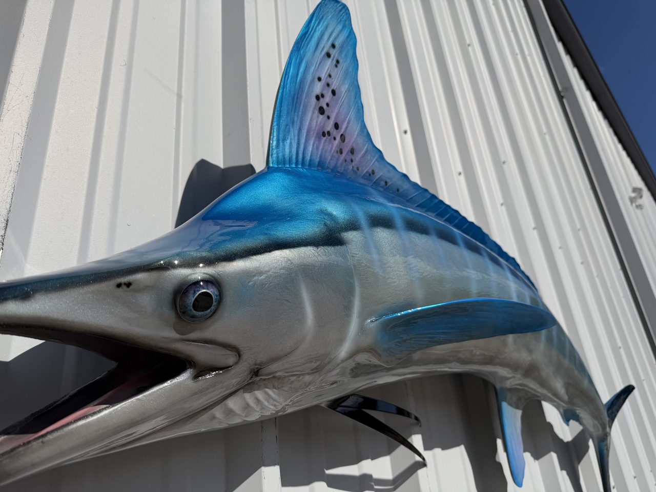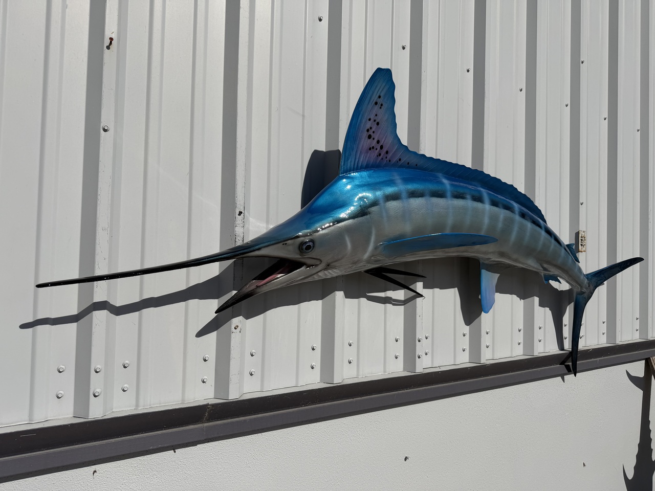 Our 87-inch White Marlin full mount fish replica represents a Caribbean White Marlin cruising through the open water. With a combination of light gold, silver, white, cobalt blue, and shades of electric blue, baby blue, and royal blue, this replica captures the essence of the majestic marlin.
